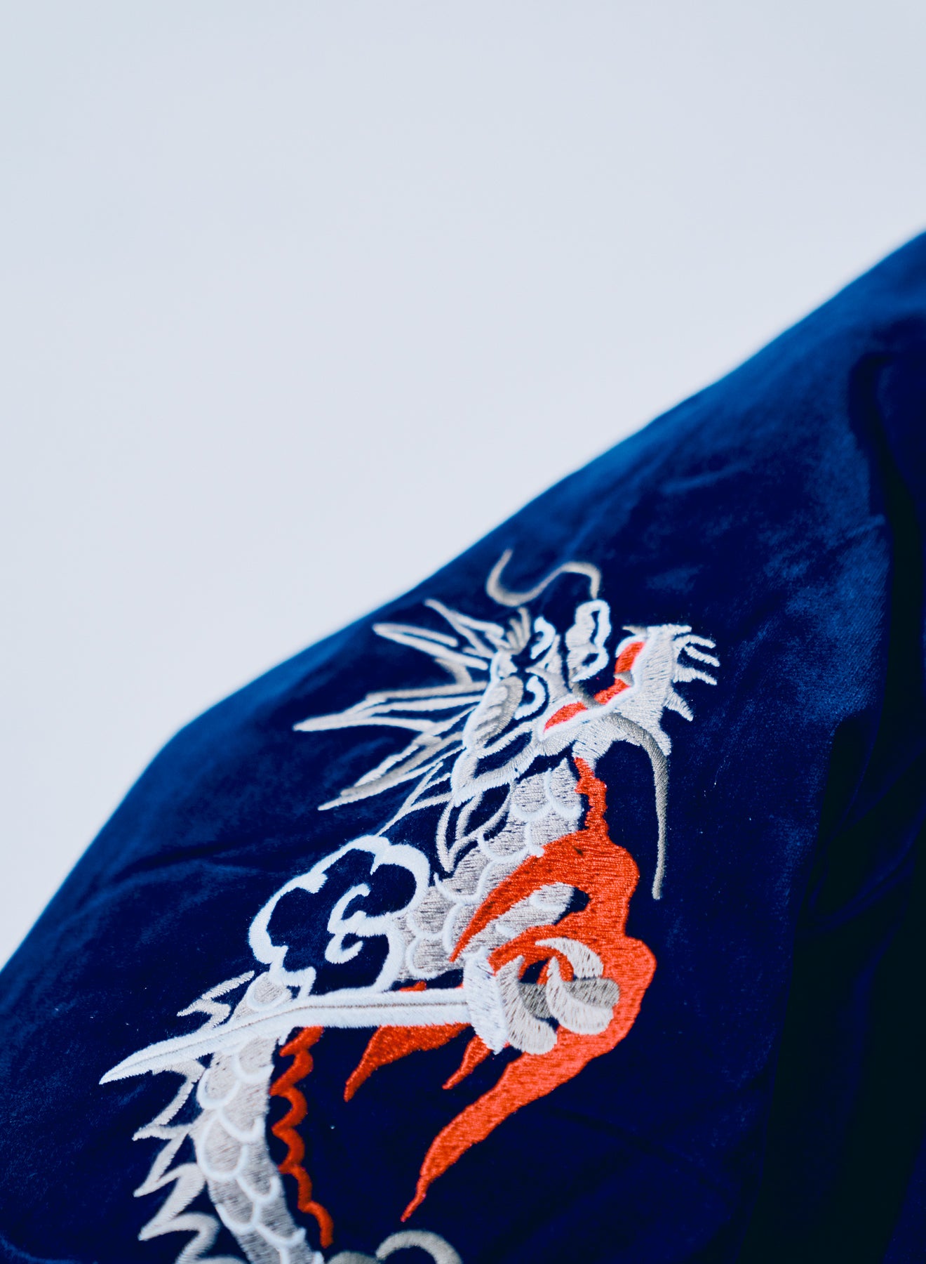 Sukajan souvenir jacket made of a 100% cotton, indigo-colored velveteen fabric. In consideration of indigo dye color transfer, we dyed this an indigo color using a special method that doesn't actually use indigo dye. The inside is made of black satin and has a thin padding. Based on a famous composition centered around a skull that can be seen on some actual vintage items, this Samurai-like design has a skull wearing a helmet, a dragon holding a sword and a military banner, and so on. The embroidery is based on an actual hand-drawn pattern, and has a very powerful aura. The ribbed parts are also knitted only by special order.