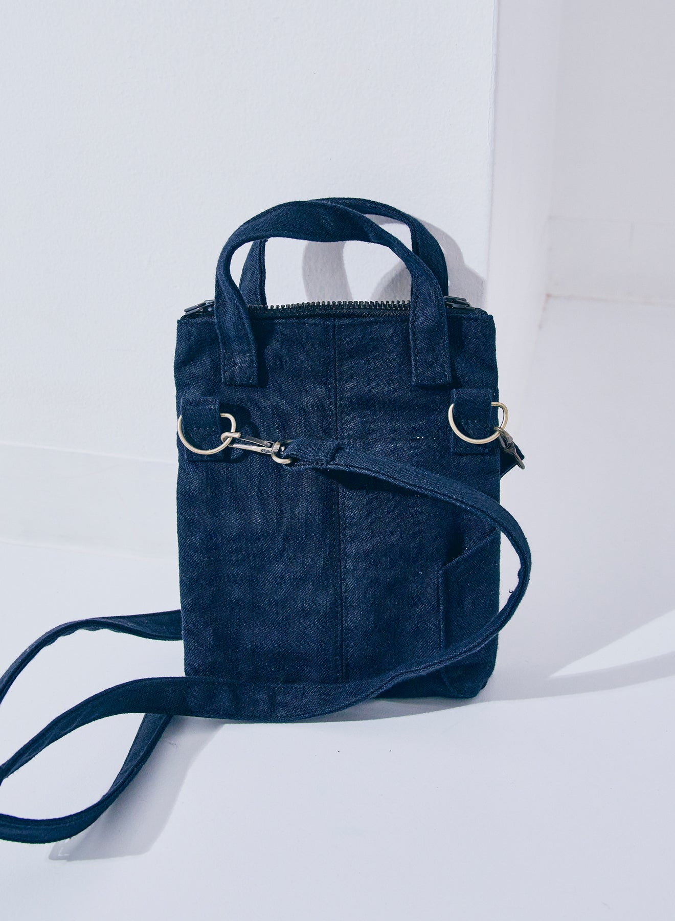 Mini helmet bag made of 15oz Otokogi selvedge denim. It is a compact version of the helmet bag developed by Samurai Jeans, and is large enough to hold an iPhone, mini wallet, or other small items. It also has a small pocket on the front side for storing pens.
