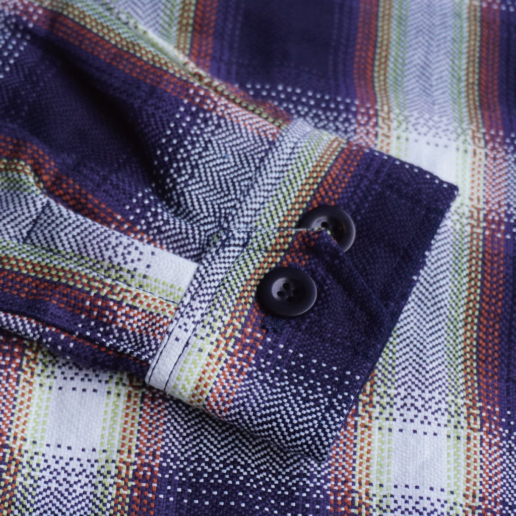 This heavyweight flannel is woven with a slubby yarn so thick that it’s normally used for making 10oz denim. The yarn is rope-dyed a very dark blue using a method loosely known as dropout reaction dyeing which helps to better keep the color. As the yarns gradually fade, the overall pattern and look of the shirt will evolve and change. With a non-brushed interior , and will give you many years of fading enjoyment.