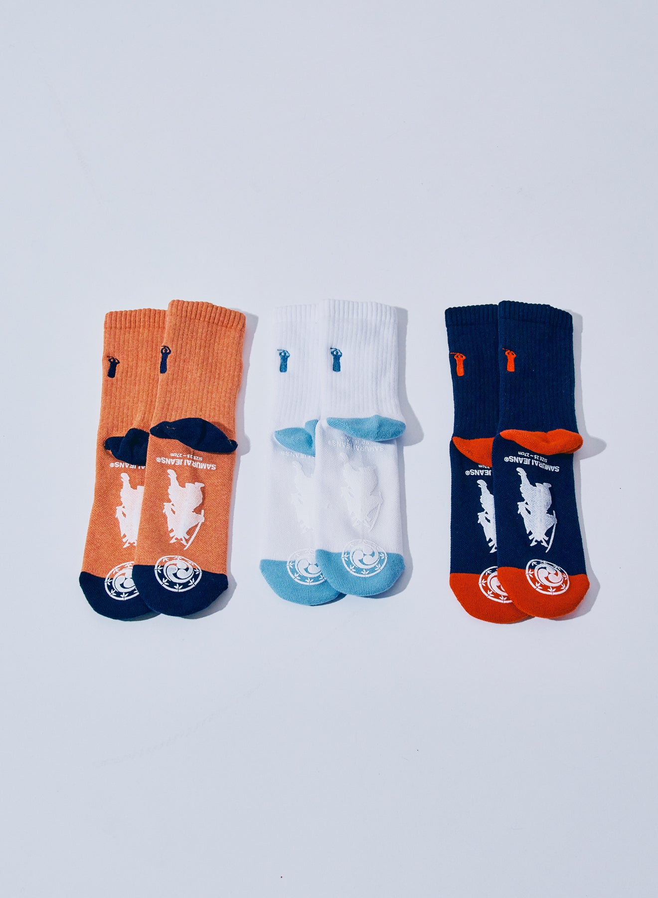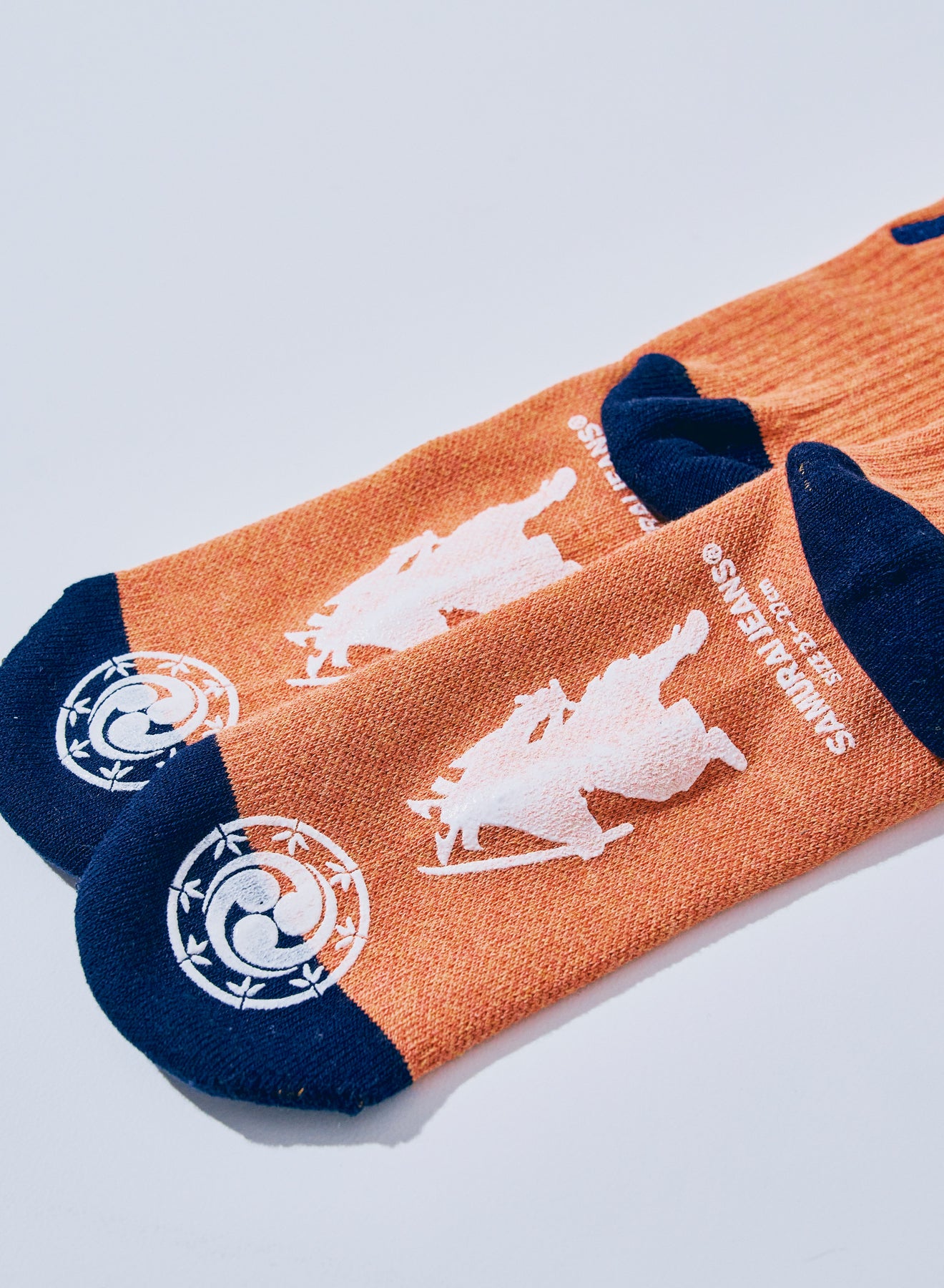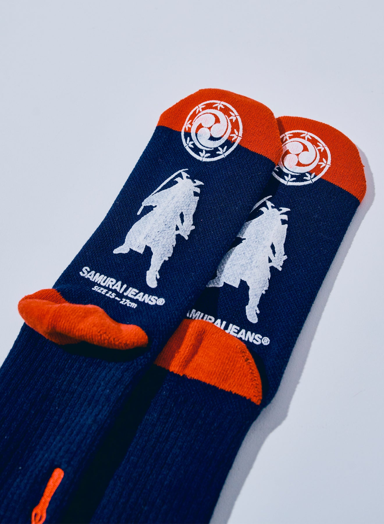 SAMURAI上段刺繍とデザインが入ったロゴ刺繍クルーソックスです。底部分はゴムプリントで滑り止め仕様になります。生地は優しい肌触りが特徴の綿を中心とした素材で、汗をしっかり吸収してくれるので、一日中さらっと心地よい履き心地です。