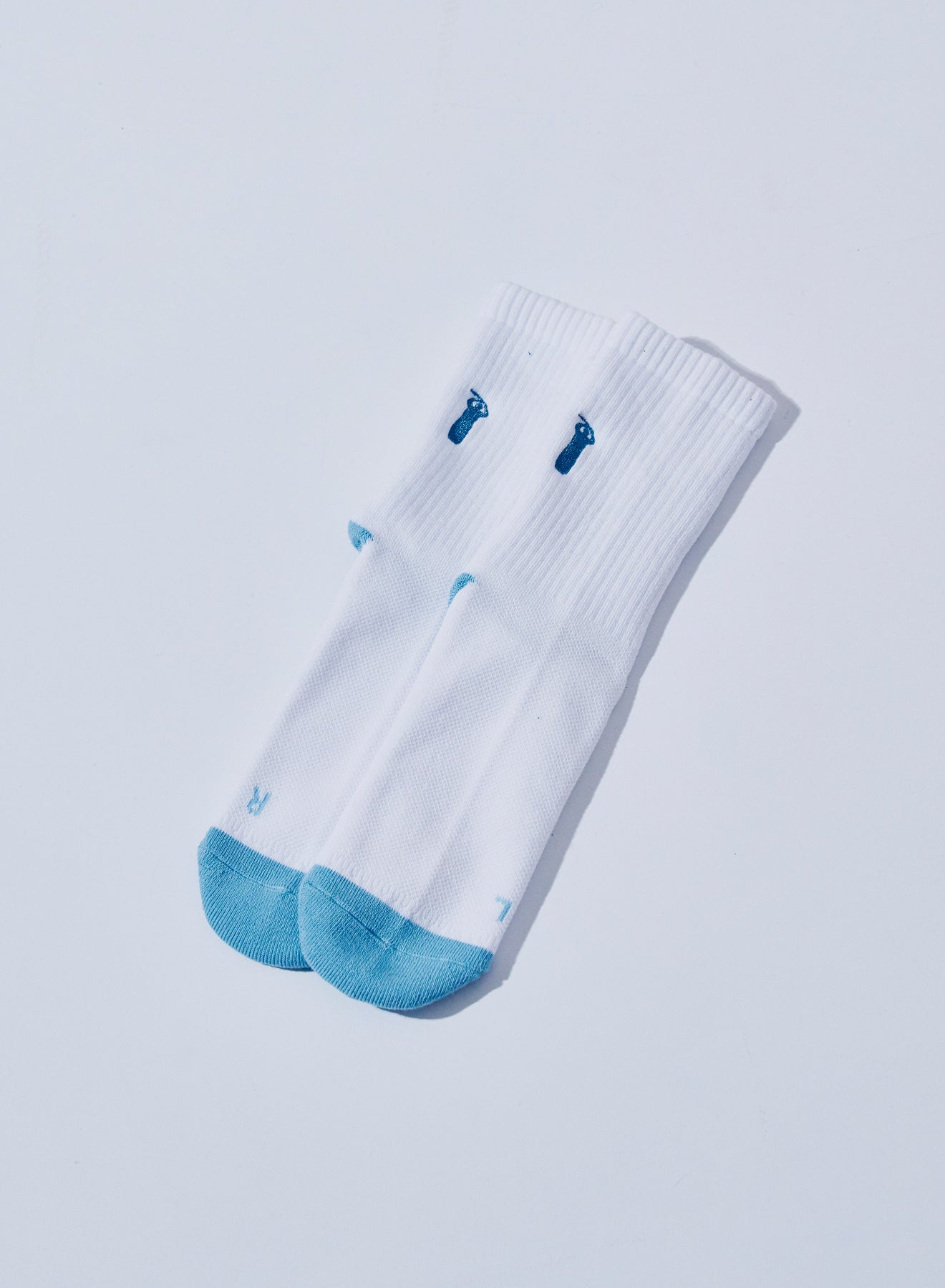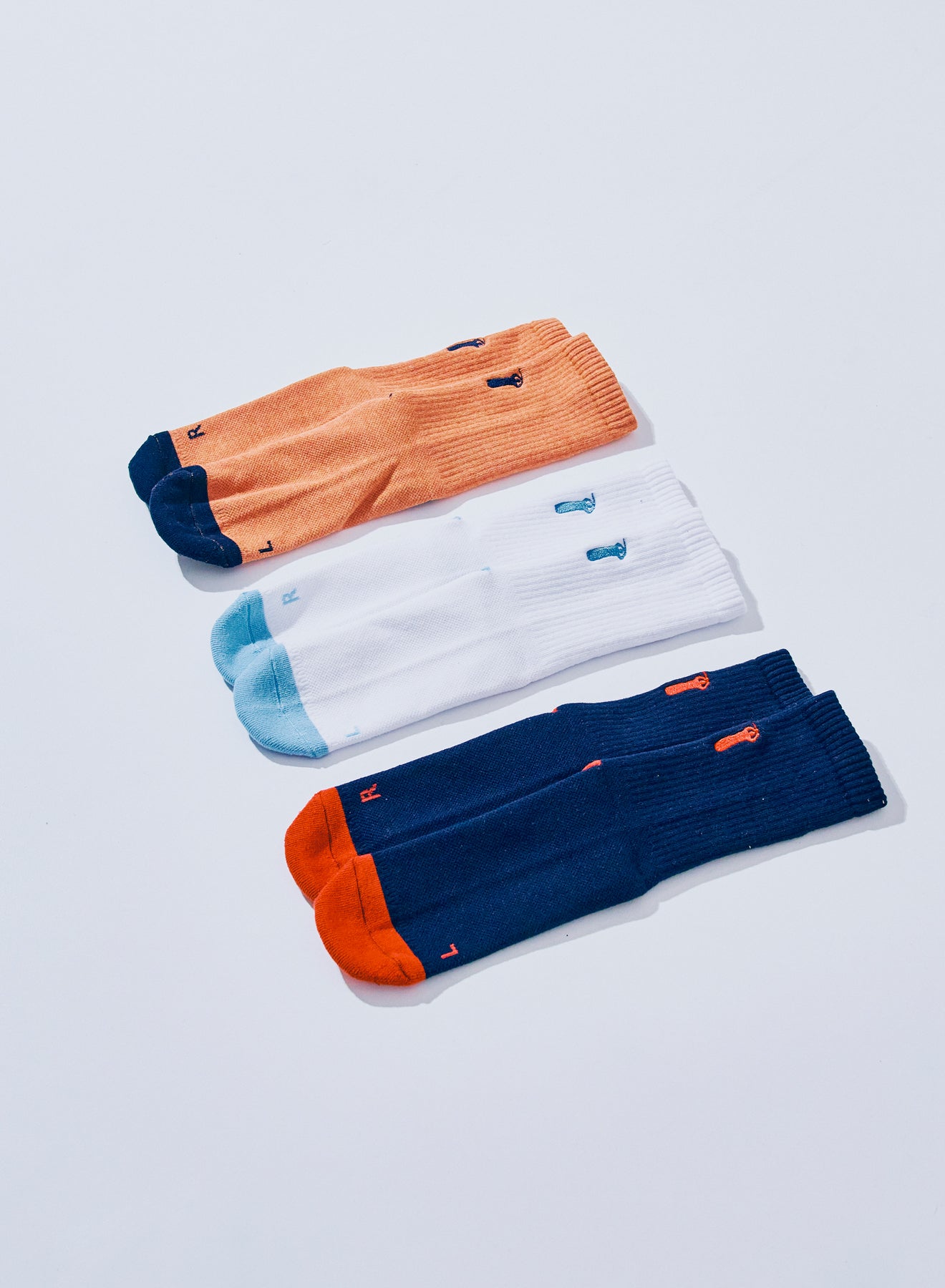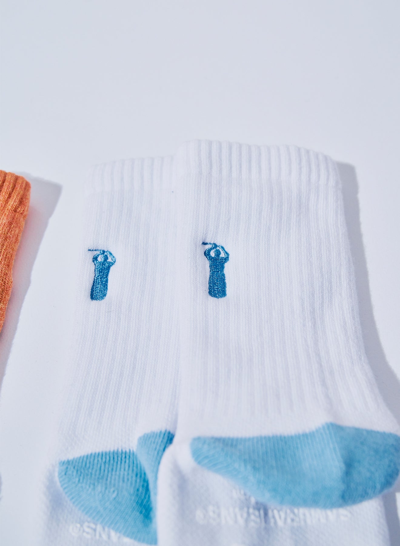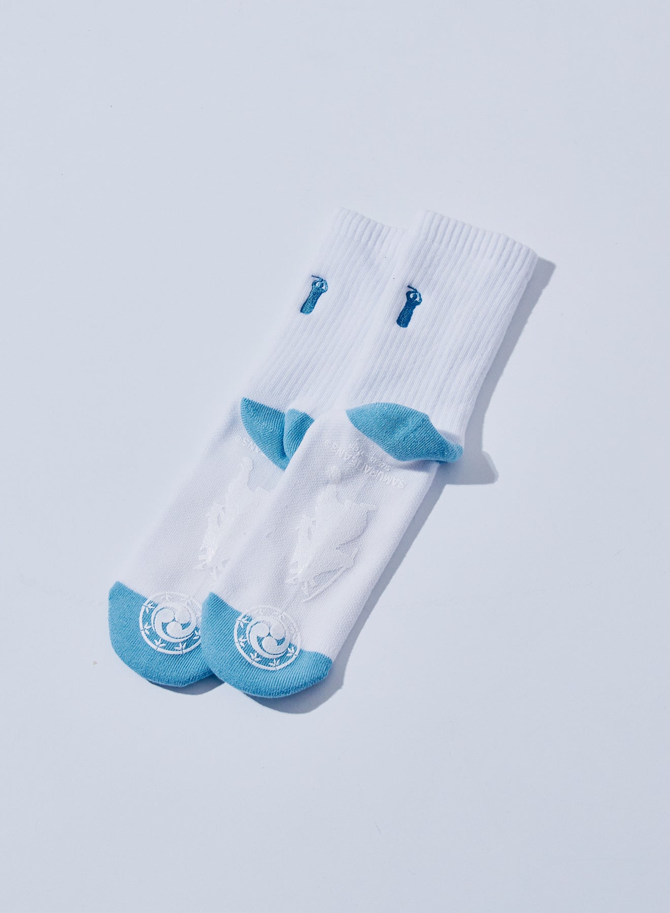 SAMURAI上段刺繍とデザインが入ったロゴ刺繍クルーソックスです。底部分はゴムプリントで滑り止め仕様になります。生地は優しい肌触りが特徴の綿を中心とした素材で、汗をしっかり吸収してくれるので、一日中さらっと心地よい履き心地です。
