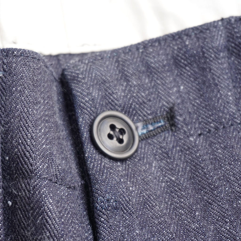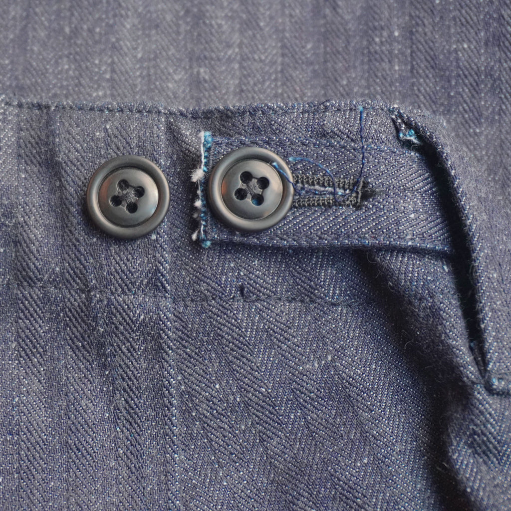 オリジナルヘリンボーンデニム生地によるワイドパンツです。生地は、緯糸にグレー糸を使用したインディゴ・ブラック・オートミールの 13ozSWCオリジナルヘリンボーンデニム3色です。緯にグレーに染めたネップ糸を織り込んでいるので、縦糸の色味と相俟って非常に雰囲気の良い生地に仕上がっており、へリンボーンデニム特有の経年変化を楽しめます。ウエスト帯の両サイド部分にはアジャスターベルト・ボタンを設置しており、サイズの微調整が可能です。股上が深く全体的に太めの無骨なシルエットです。ビンテージライクなワイドパンツですが、オールシーズン着こなし可能で、幅広いスタイルに合わせたくなる一本です。