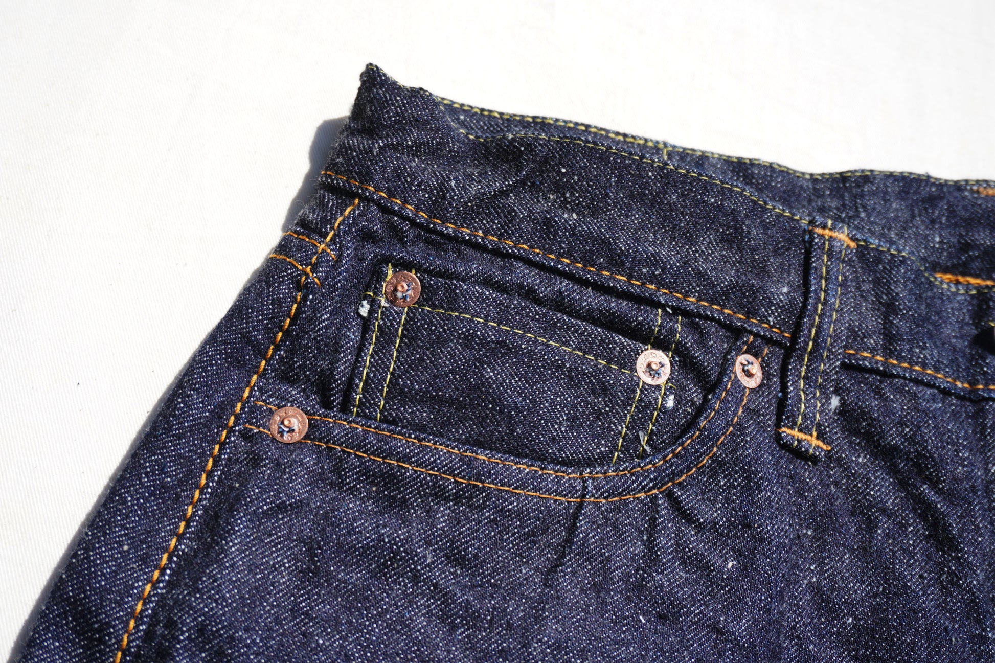 We’ve used our 15oz Otokogi denim for these, taking our slubby #6 cotton thread, leaving the little bits of cotton waste in the mix, and pushing the vintage looms to the limit. This gives these jeans a rough look and texture, while also allowing for those much-loved high contrast fades.