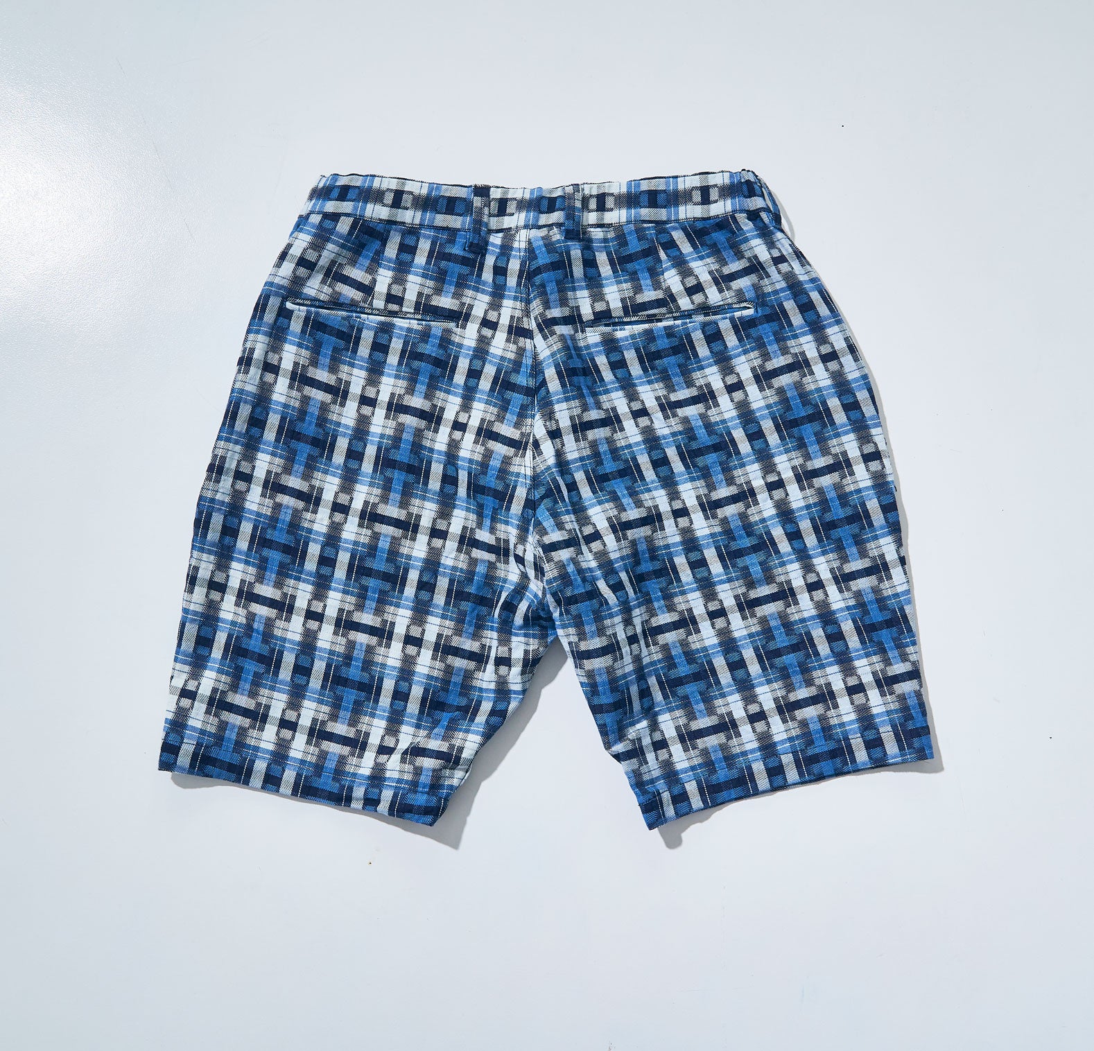 Easy shorts in indigo "broken lattice" fabric. These have a short length above the knee, with room around the waist and a slight taper to give a clean-look silhouette. The back half of the waist is elasticized, and a zipper is used for ease of wear.