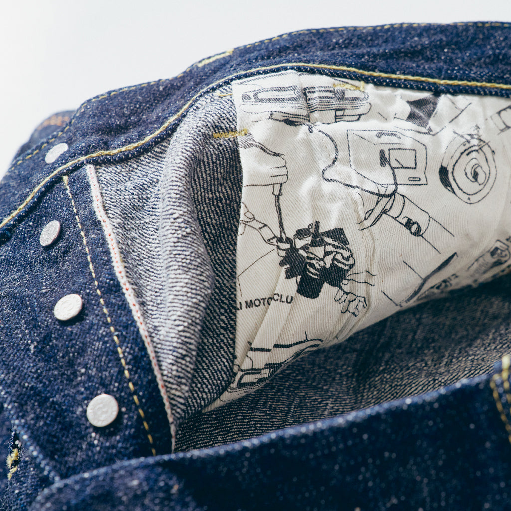 Other details include our Automobile Club tire buttons, Rising Sun labels, and the automotive parts-patterned pocket bags. For the sewing, we’ve used two colors: yellow and golden brown, with the stitch count, needle count, and stitch width all varied according to each part of the jeans to bump these up to the next level of attention to detail. The double-knee part of these pants is diamond-stitched in the same color as the fabric so that the stitching pattern will begin to stand out as the material itself fades. The silhouette is slightly slim and easy to wear as actual work pants.