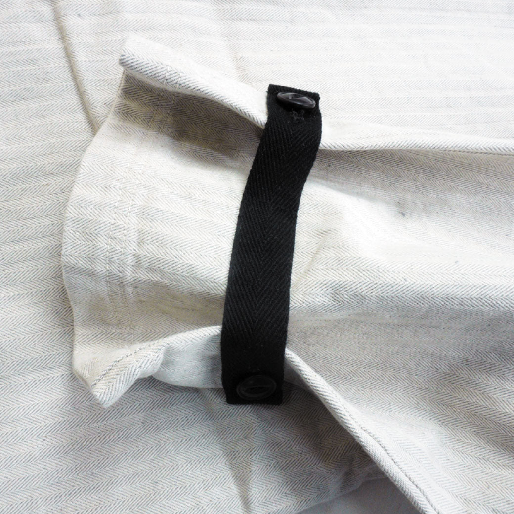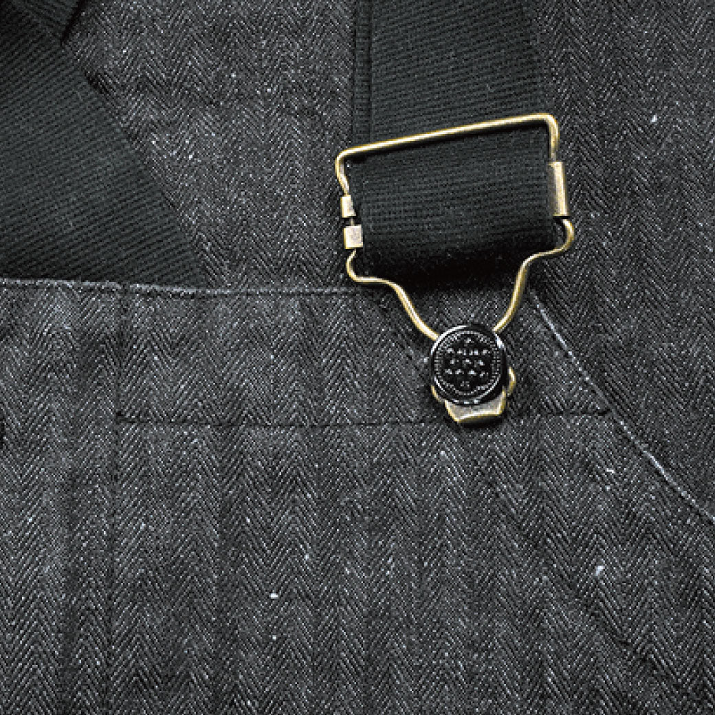 生地は、緯糸にグレー糸を使用したインディゴ・ブラック・オートミールの 13ozSWCオリジナルヘリンボーンデニム3色になります。緯にグレーに染めたネップ糸を織り込んでいるので、縦糸の色味と相俟って非常に雰囲気の良い生地に仕上がっています。インディゴは色落ちする事によって左綾が際立ち、たて筋が目立つとストライプ調になり特有のエイジングを楽しめます。ブラックは硫化染料によるロープ染色なので激しい色落ちが期待できます。デッキパンツらしくシルエットは少しゆったりとした穿きやすい形で、肩部のストラップで調整ができ、裾のストラップは裾を絞ることができます。通年穿けるオールシーズン着こなし可能で、幅広いスタイルに合わせたくなる一本です。