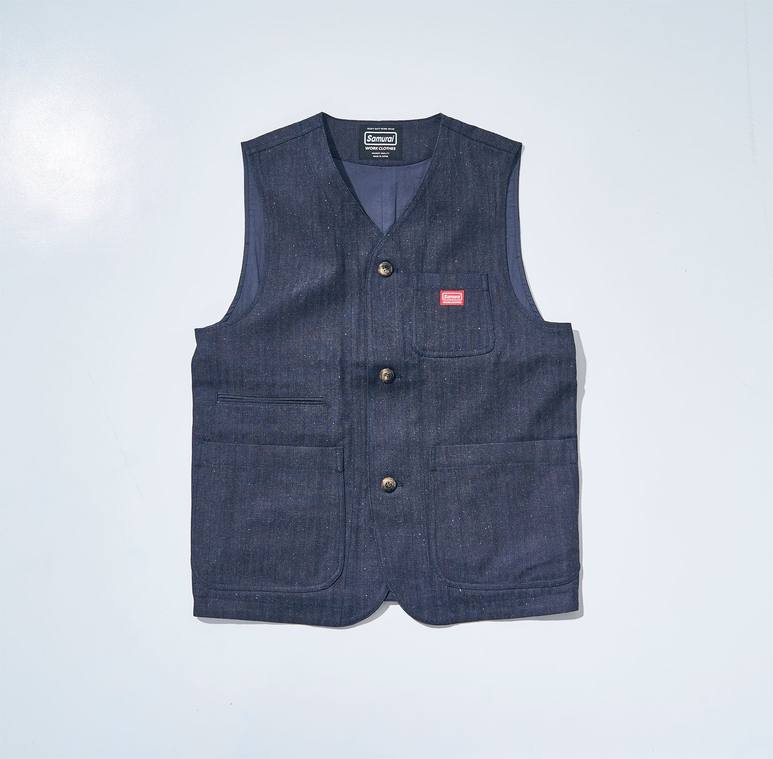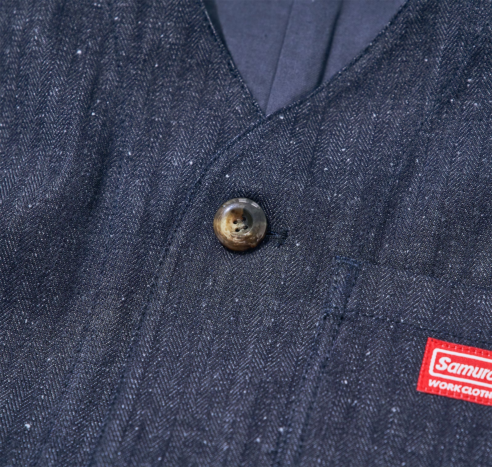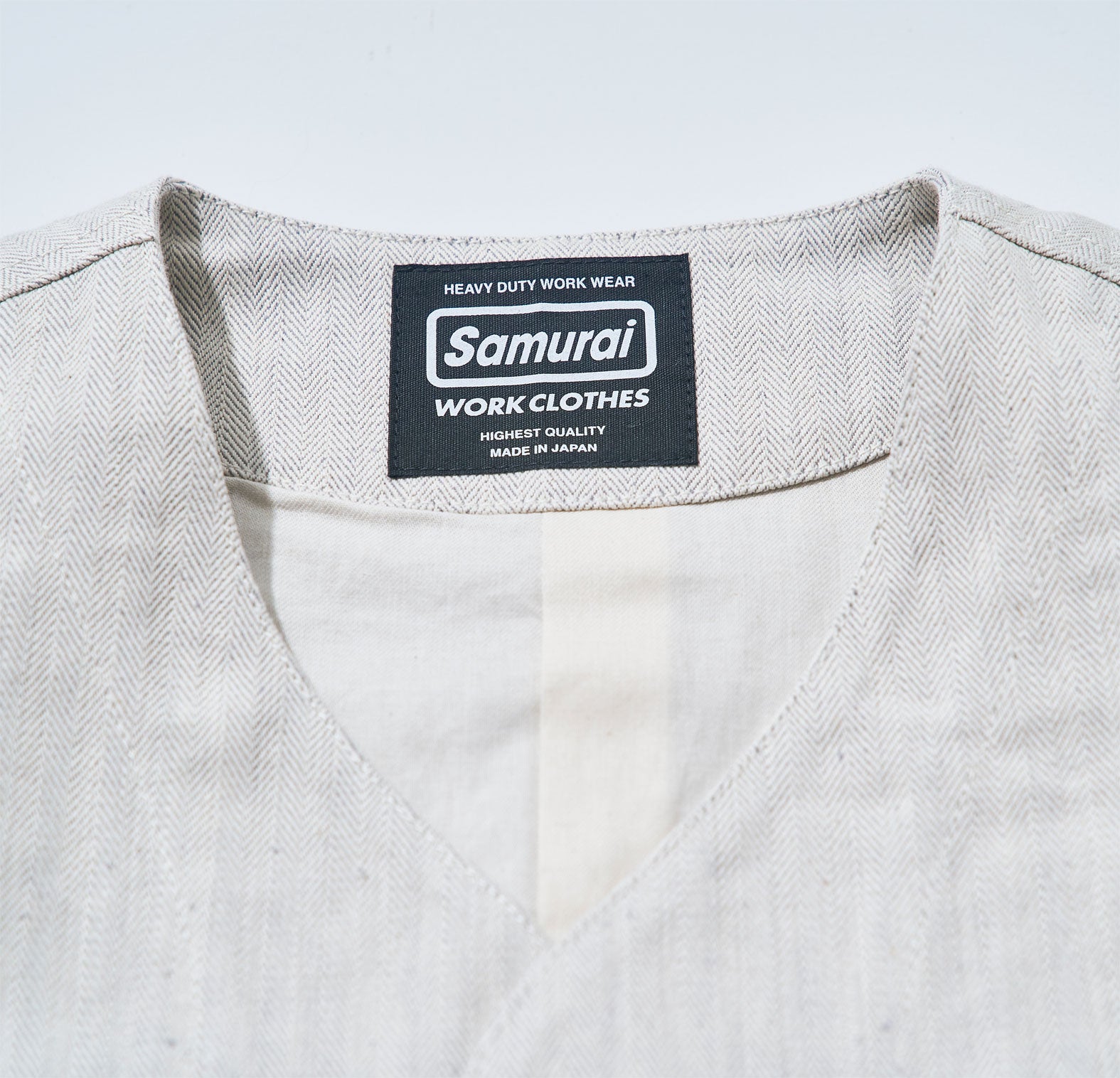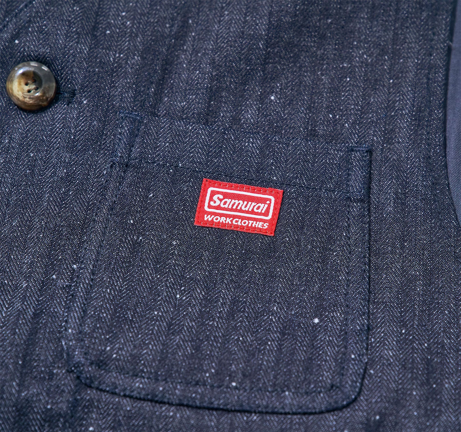 Spec: 13oz weft gray indigo herringbone denim / 13oz weft gray black herringbone denim / 13oz weft gray oatmeal herringbone denim / Samurai WORK CLOTHES exclusive label / Made in Japan