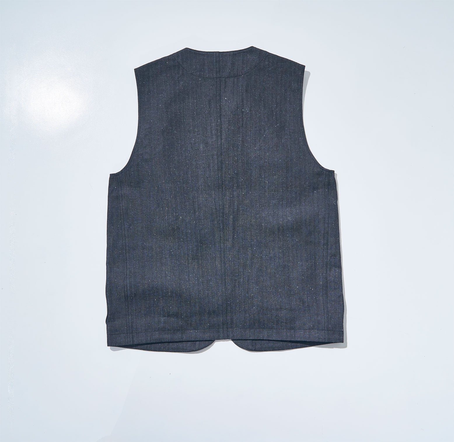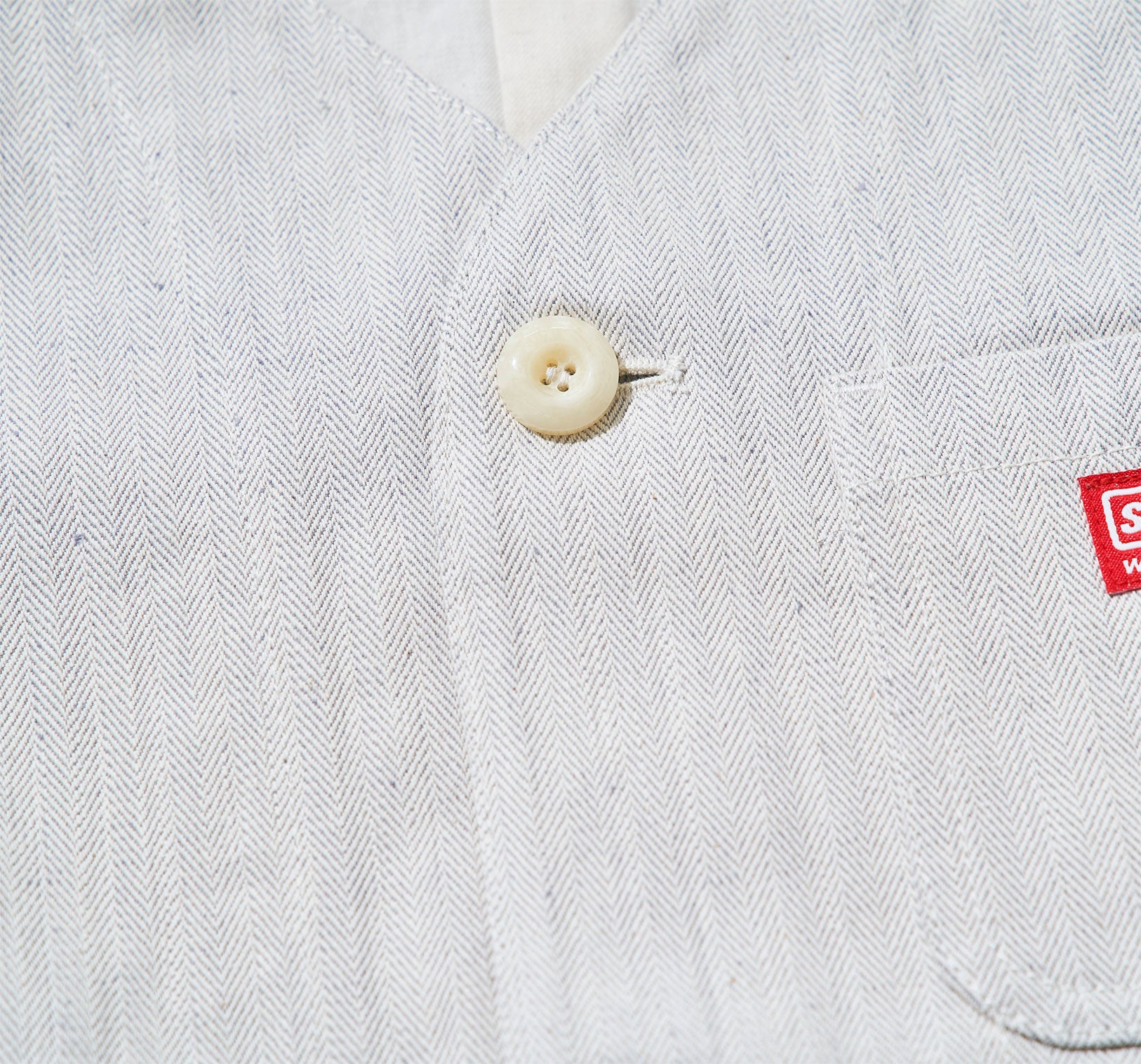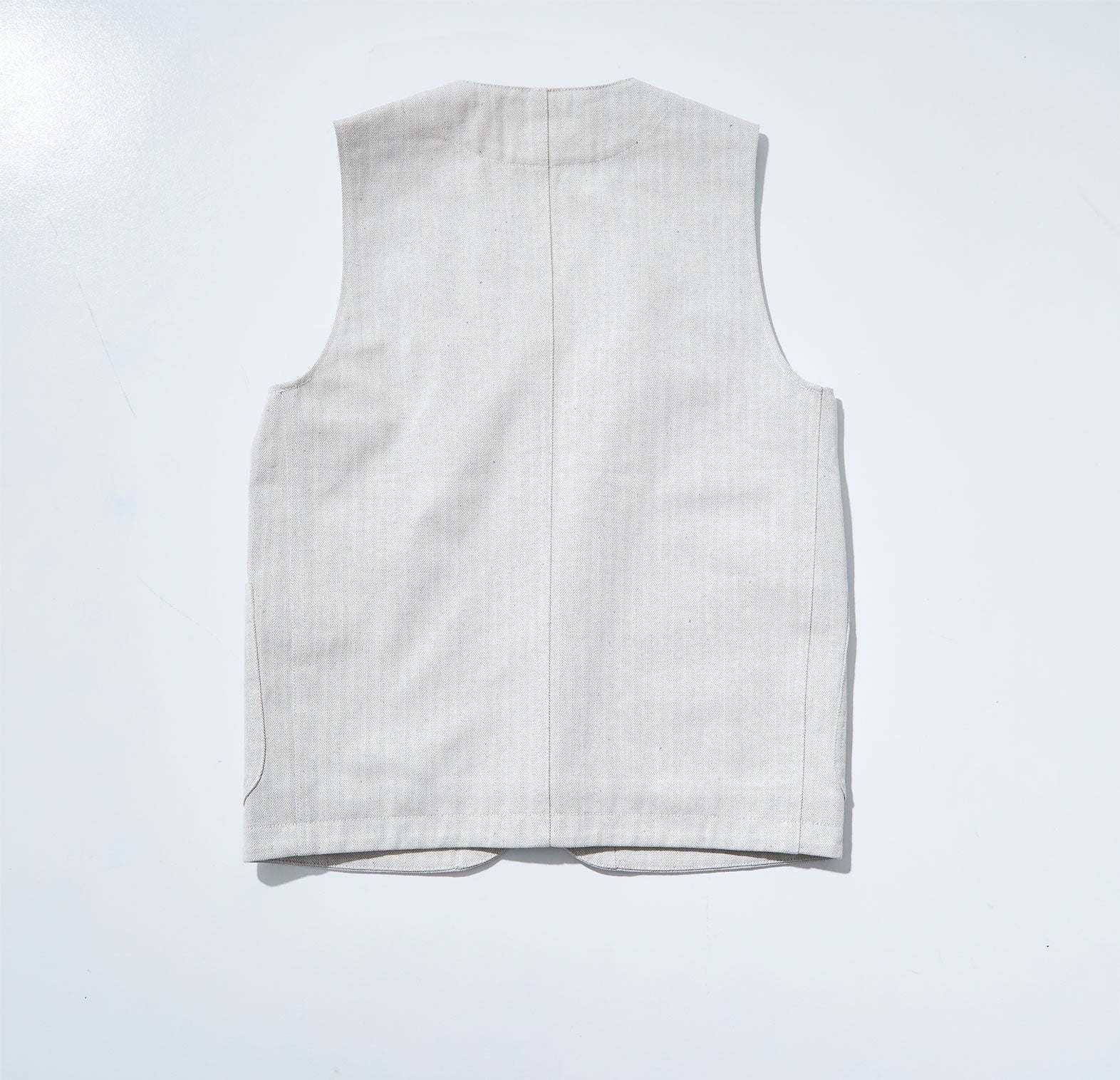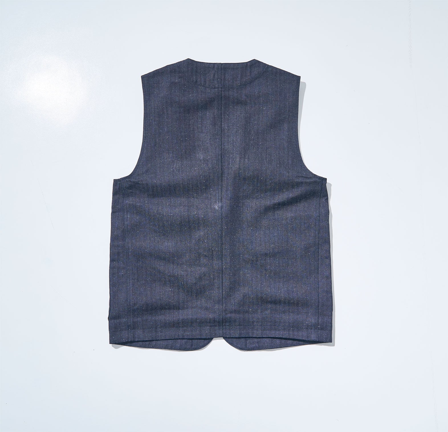 This vest is made of original herringbone denim. The fabric is 13oz SWC original herringbone denim in three colors: indigo, black, and oatmeal, with gray thread used for the weft. Gray-dyed nep yarn is woven into the weft, which, combined with the color of the warp, creates a very attractive fabric. As the indigo fades, the left twill stands out, and when the vertical lines stand out, it becomes a striped look, allowing you to enjoy the unique aging. The black is rope dyed with sulfur dyes, so you can expect a strong color fade.