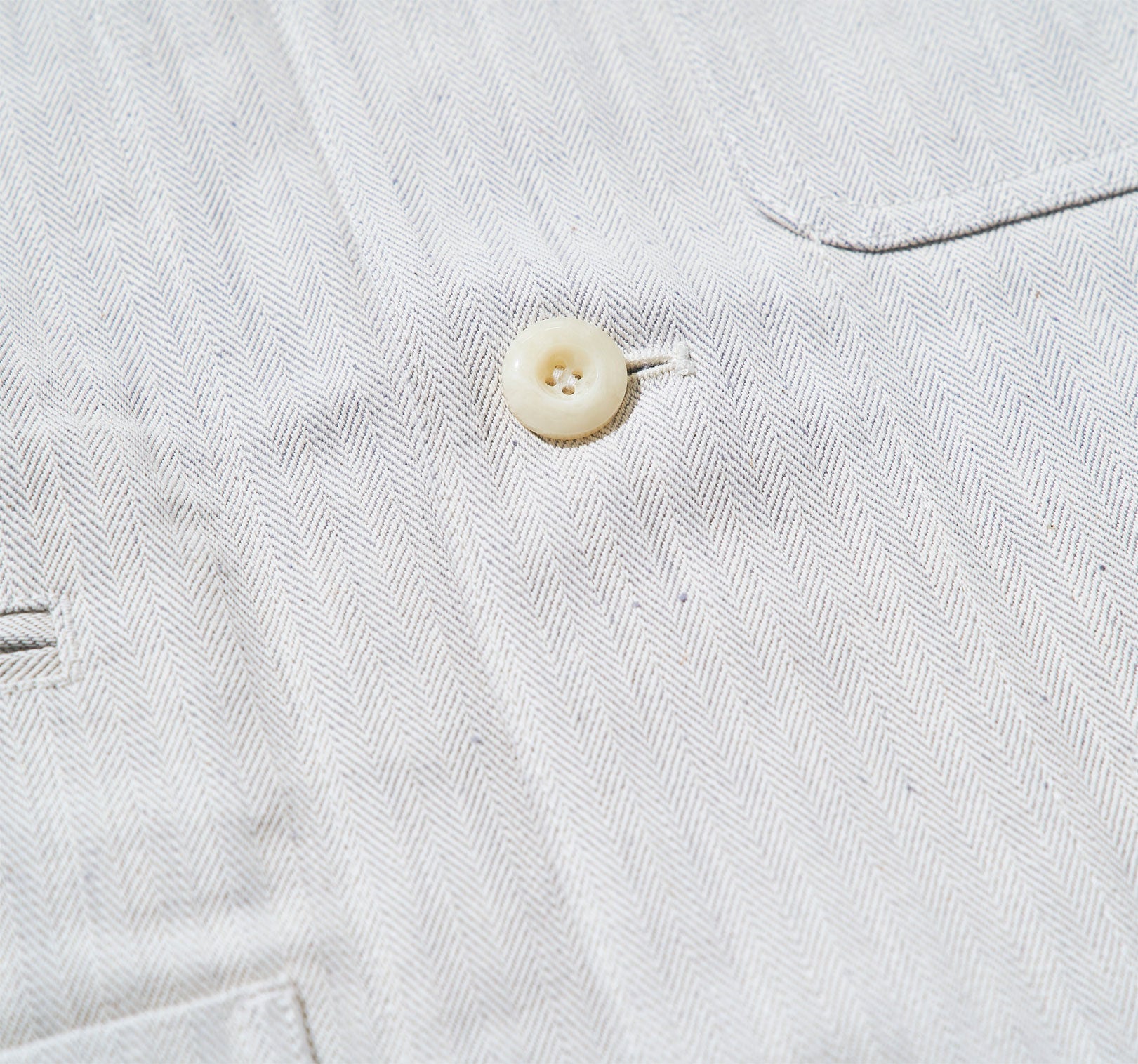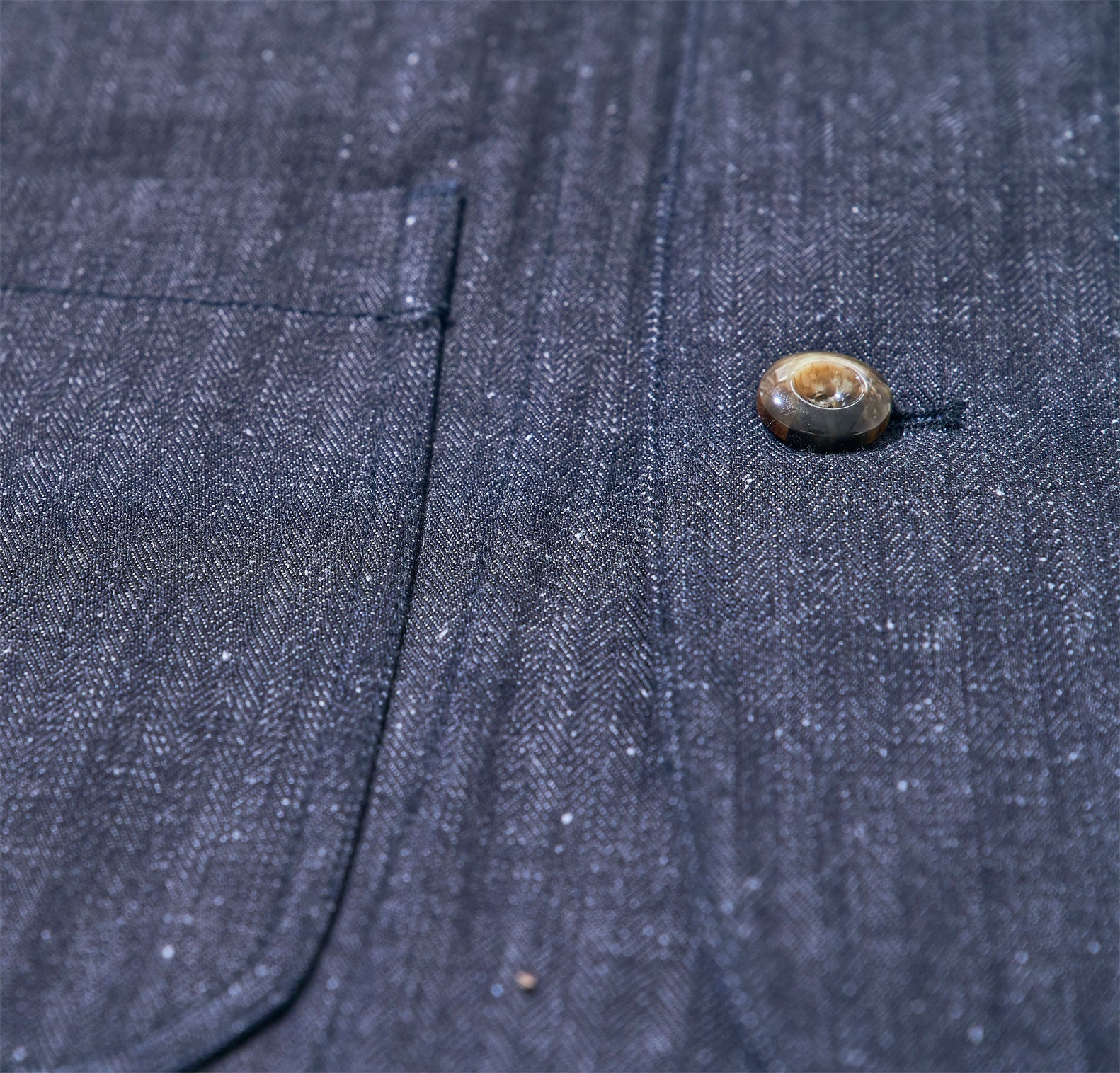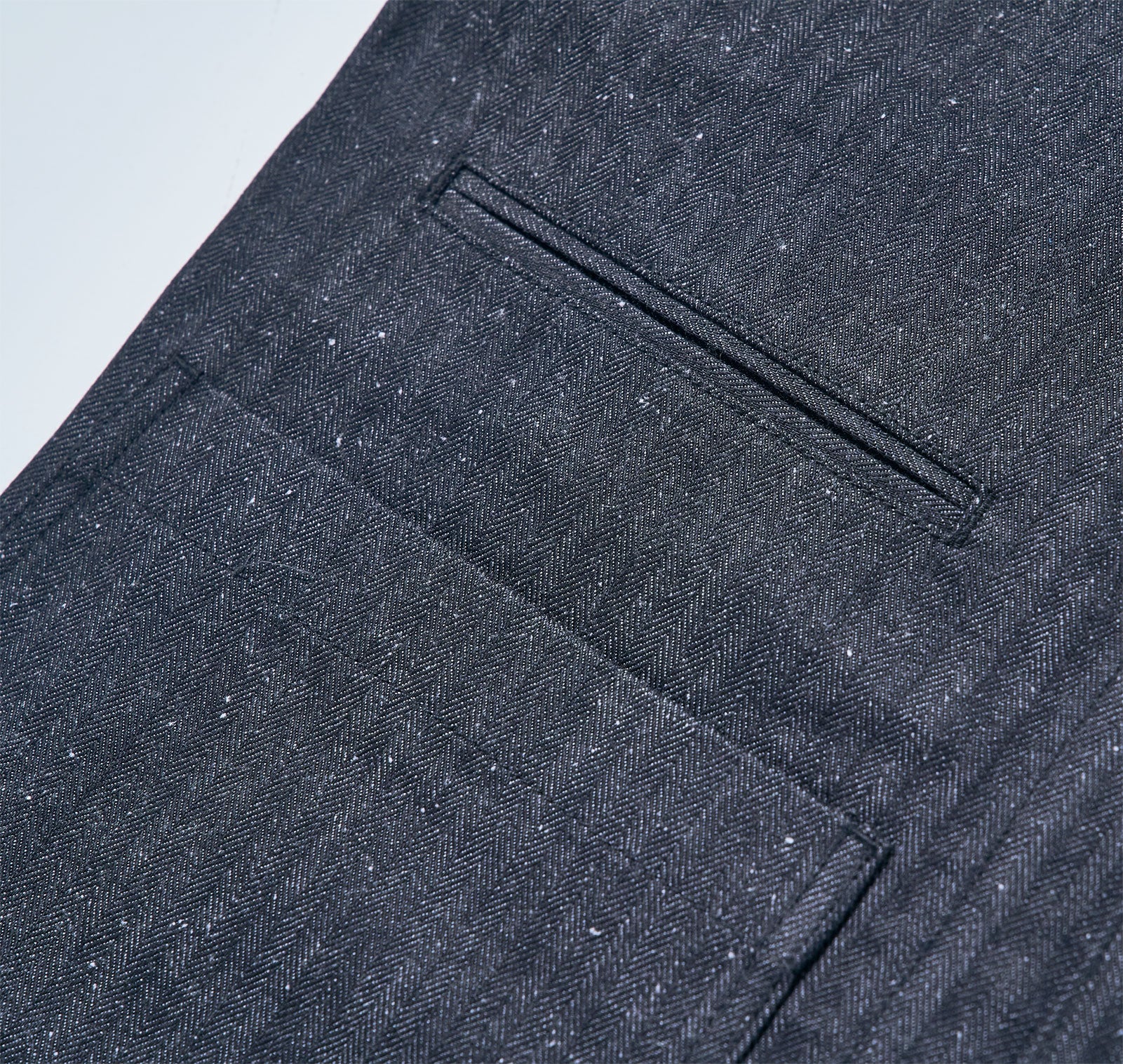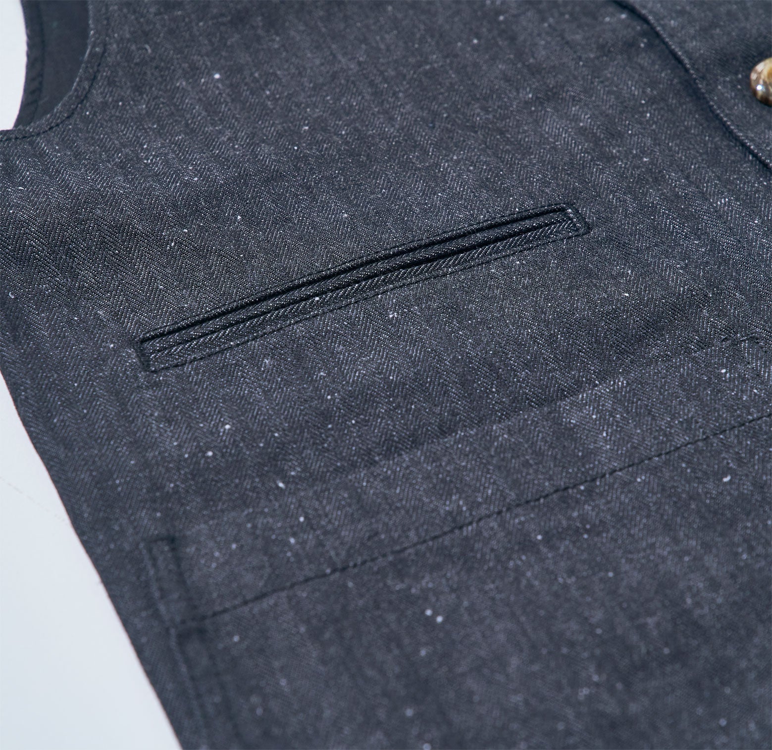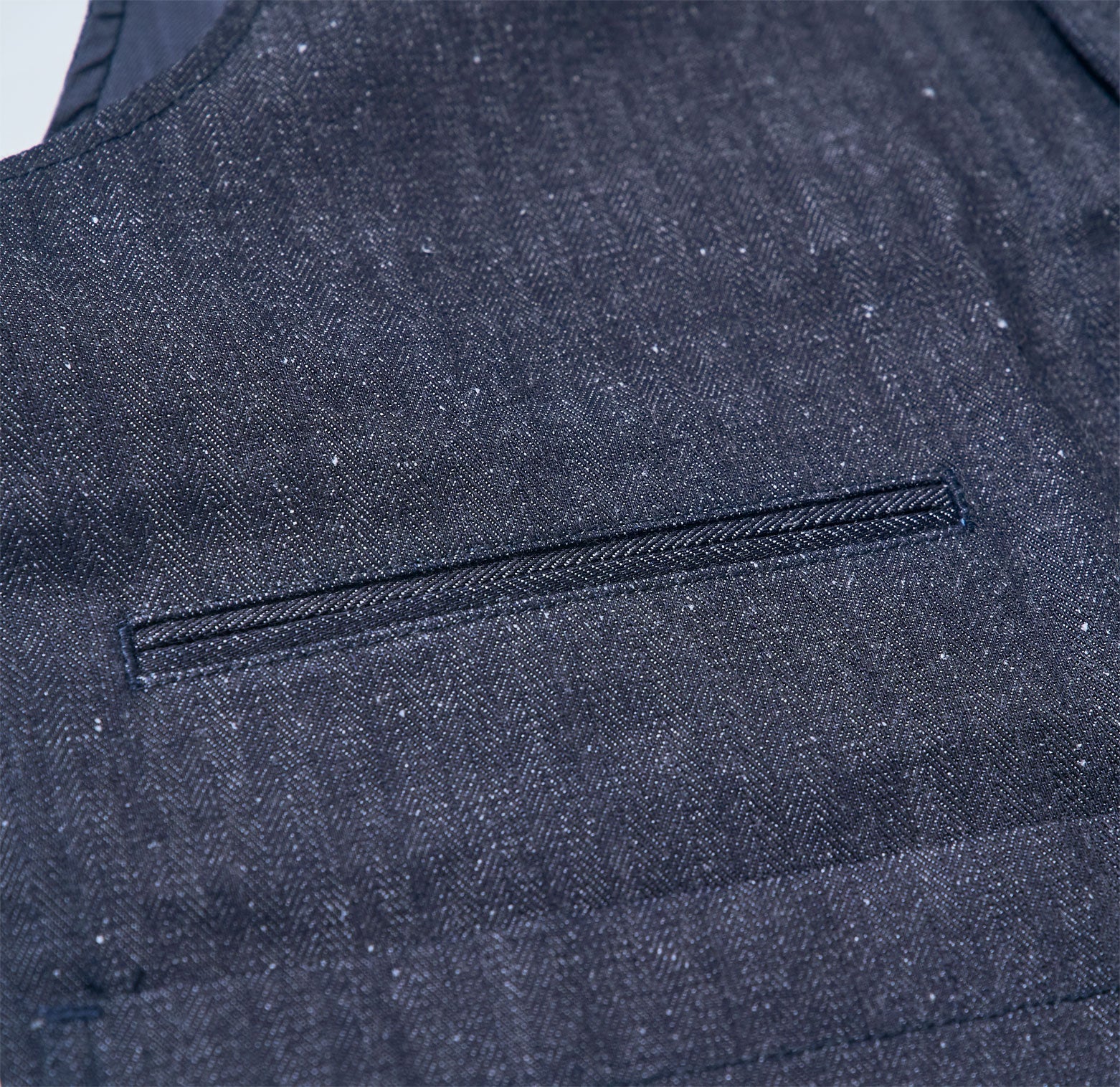 This vest is made of original herringbone denim. The fabric is 13oz SWC original herringbone denim in three colors: indigo, black, and oatmeal, with gray thread used for the weft. Gray-dyed nep yarn is woven into the weft, which, combined with the color of the warp, creates a very attractive fabric. As the indigo fades, the left twill stands out, and when the vertical lines stand out, it becomes a striped look, allowing you to enjoy the unique aging. The black is rope dyed with sulfur dyes, so you can expect a strong color fade.