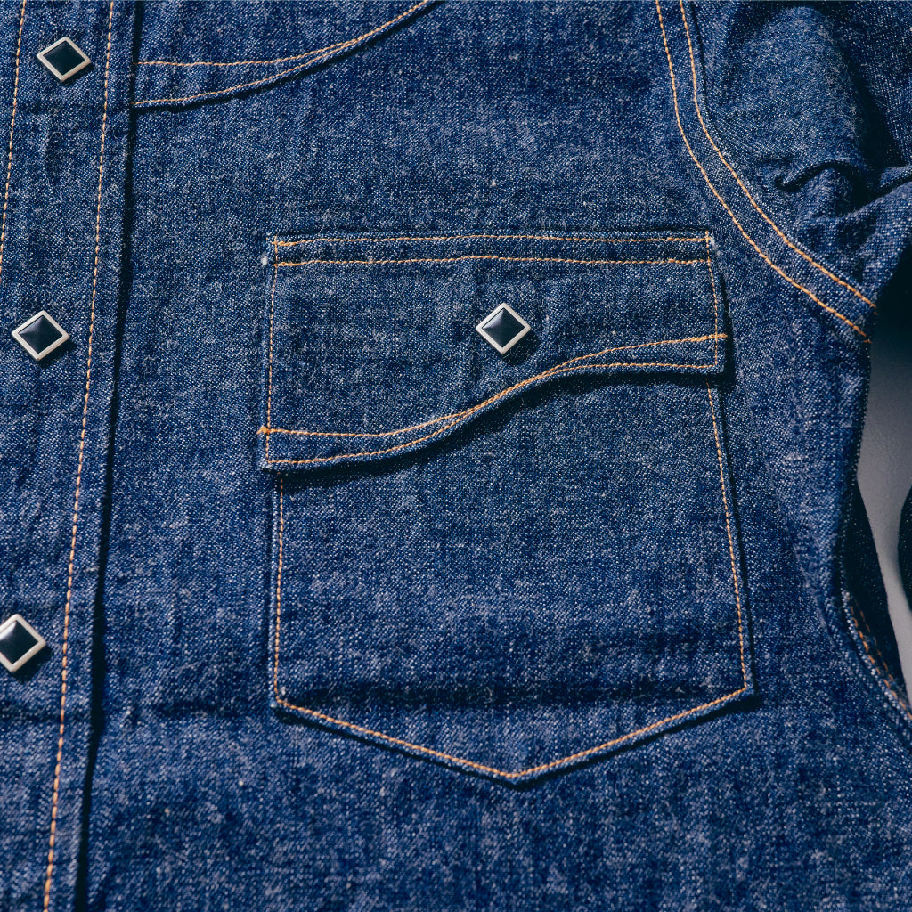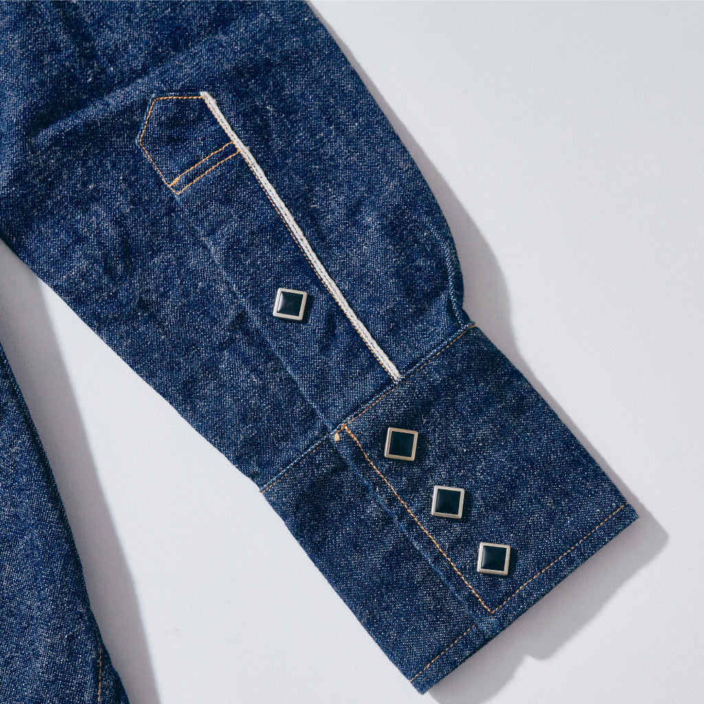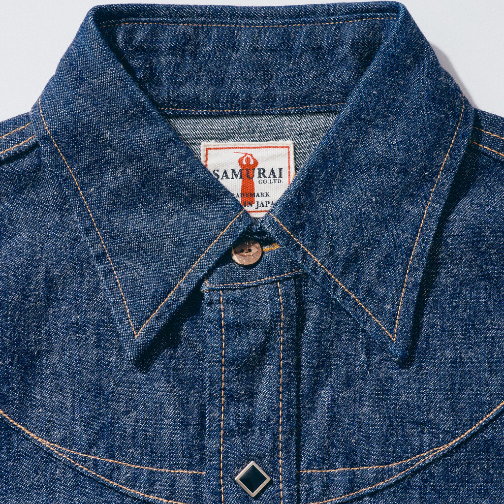 A denim western shirt. The fabric is a Samurai original made from irregular #10 yarn, and it sports a tight and well-balanced silhouette. We’ve used cotton for the stitching and have added details like winding stitches, square dot buttons, and a nut cat eye button on the top. The yoke and pockets were designed with the image of Samurai flying stitches to represent the flying blade of a katana.