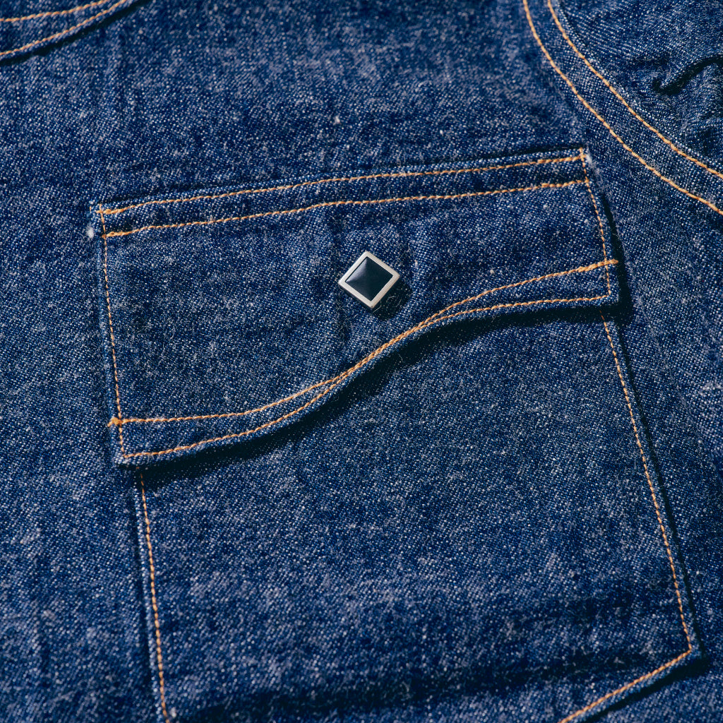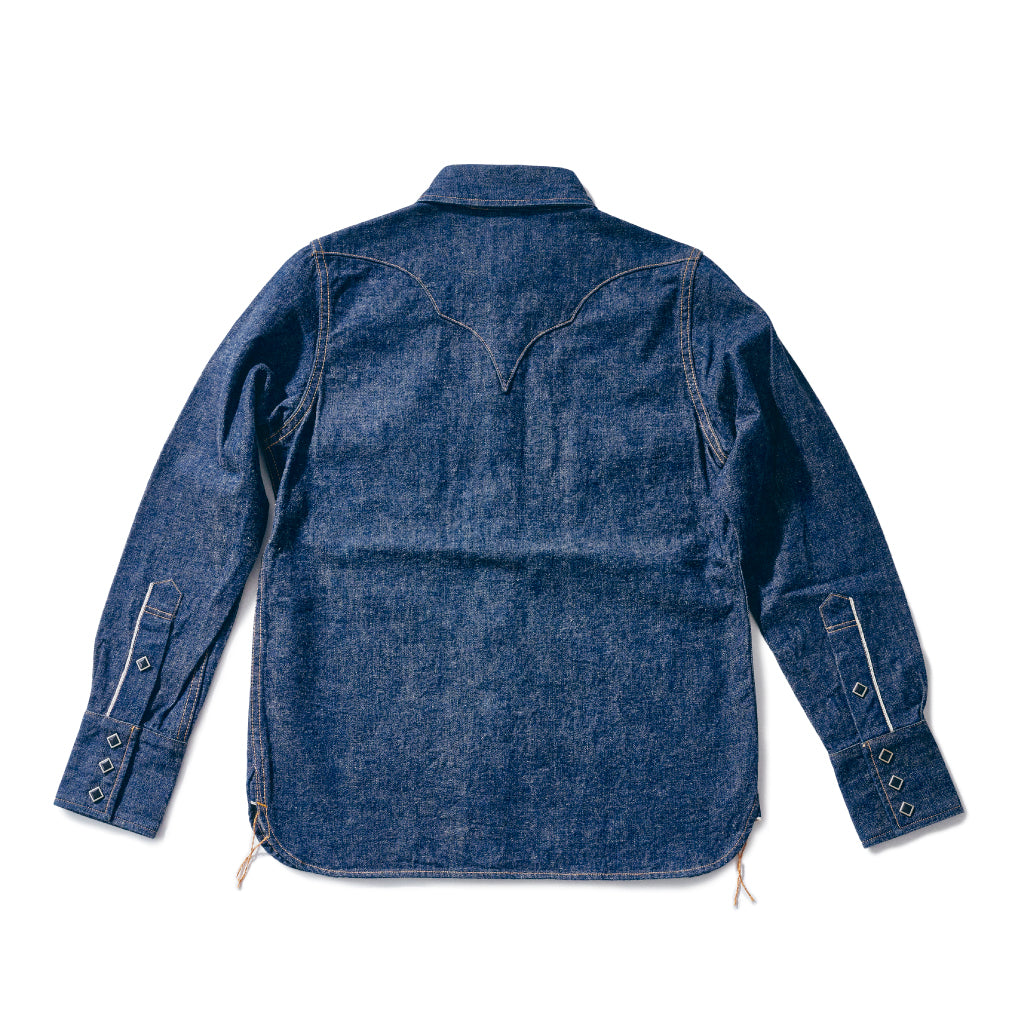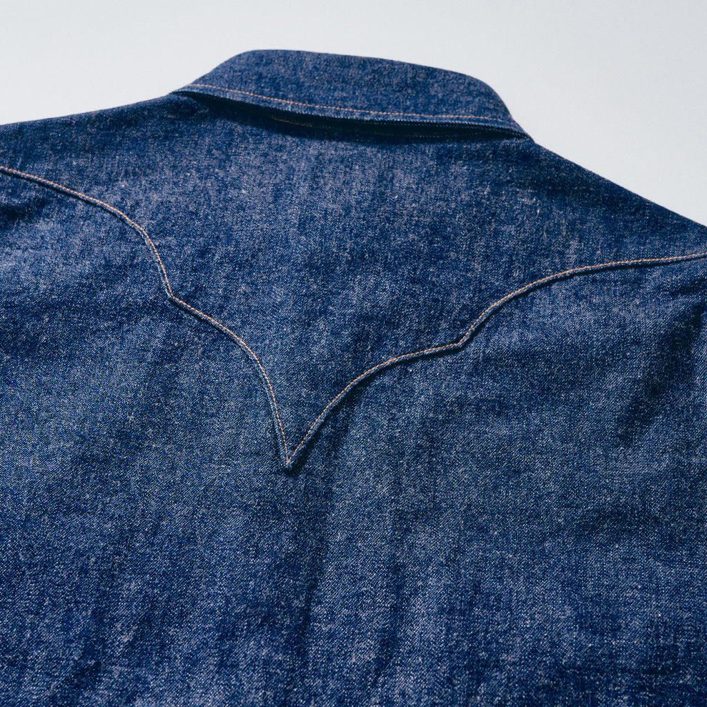 A denim western shirt. The fabric is a Samurai original made from irregular #10 yarn, and it sports a tight and well-balanced silhouette. We’ve used cotton for the stitching and have added details like winding stitches, square dot buttons, and a nut cat eye button on the top. The yoke and pockets were designed with the image of Samurai flying stitches to represent the flying blade of a katana.