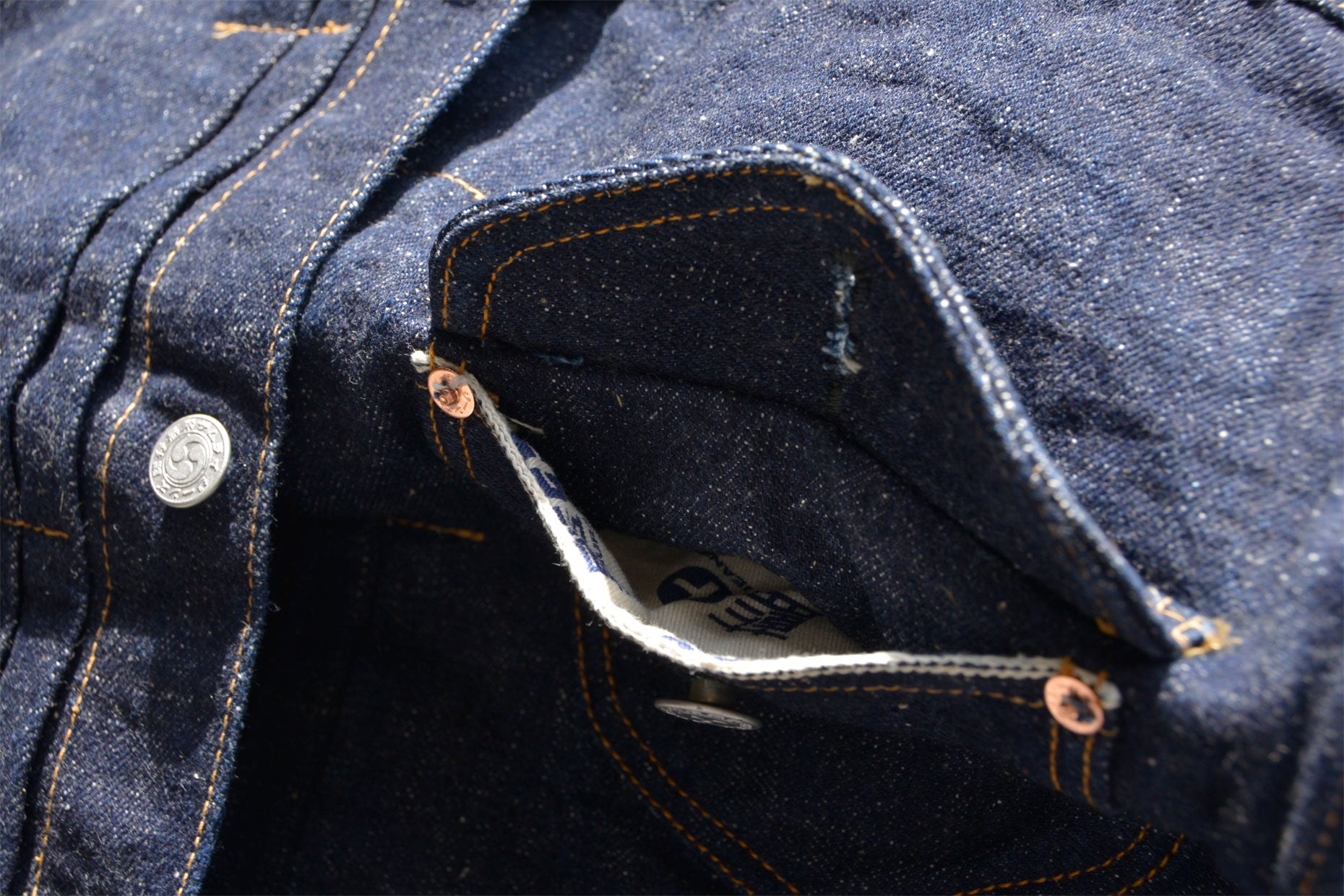 ロープ染色のためインディゴデニム同様に激しいアタリ感が望めますが、サムライ定番インディゴデニムと比べるとじっくりとした変化を楽しめます。また、セルビッチ部分も藍+の経糸を使用しており、耳糸の色の変化も見逃せません。ボタンは藍+用シルバー太鼓ボタン、ポケット内には藍+プリントスレーキを採用しています。