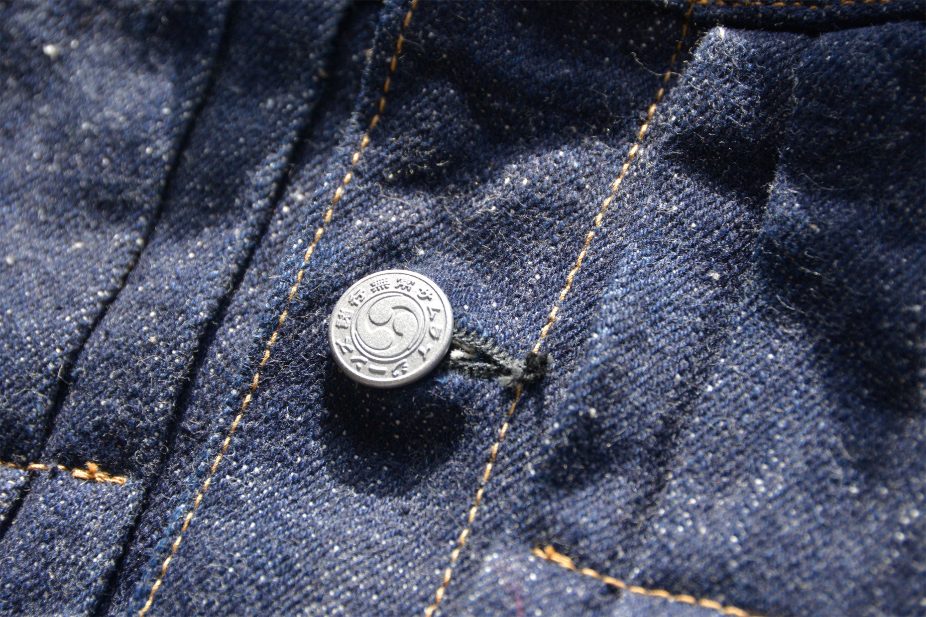 藍+デニムジャケットです。生地は、枷の手染めに限られる「藍」を、インディゴ染料と天然藍とを特殊な手法で混ぜ合わせることで、ロープ染色を可能にしたスペシャル18ozデニムです。糸は経にオリジナルの強撚の硬いムラ糸、緯には日本で栽培した和綿「サムライコットン」を混ぜ合わせた特別な独自のムラ糸を使用しています。短繊維が特徴の和綿によるネップと強いザラ感により、荒々しい表情もありながら、同時に、色はインディゴだけでは出せない藍ならではの豊かな美しい色合いになっています。