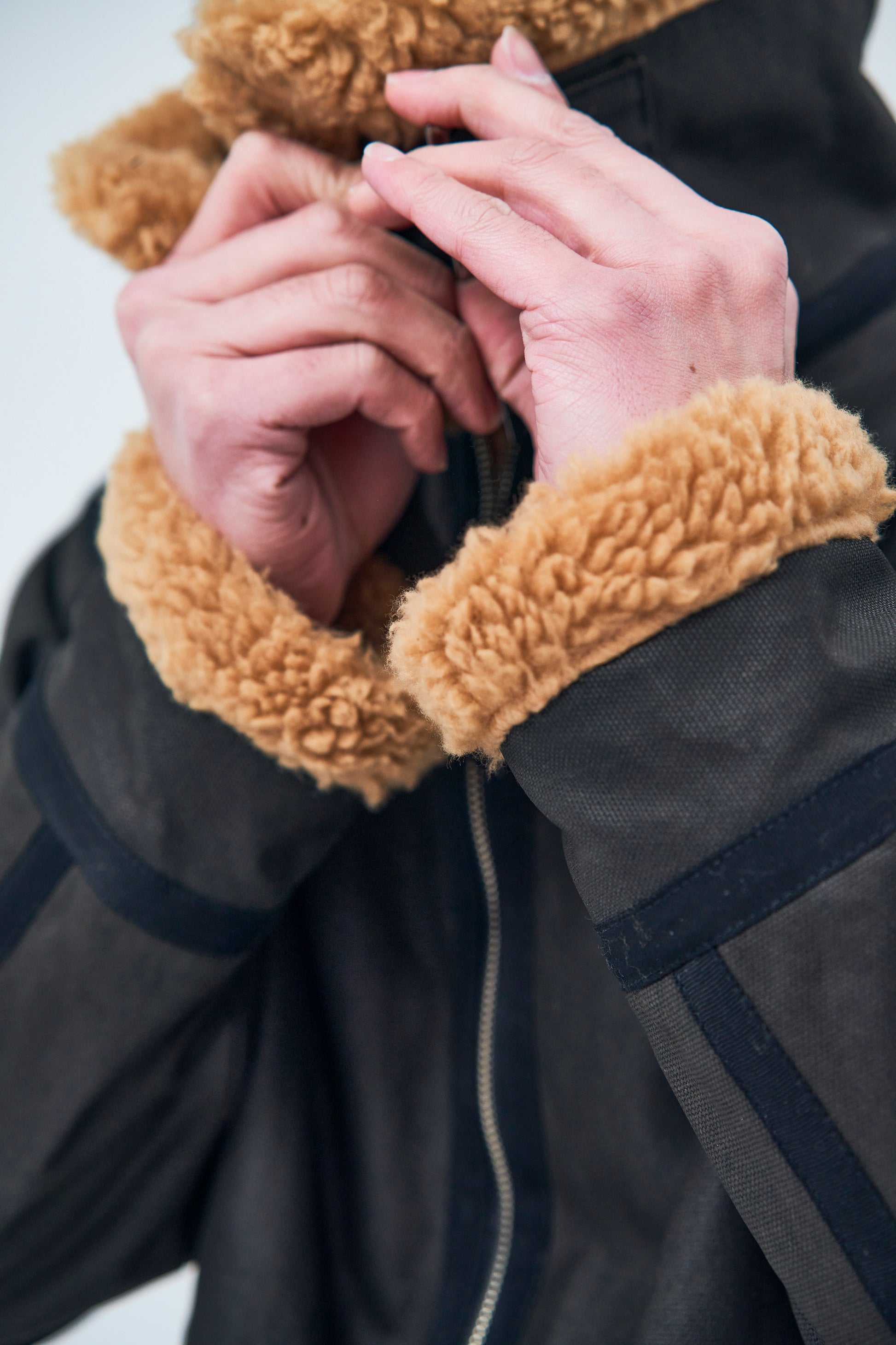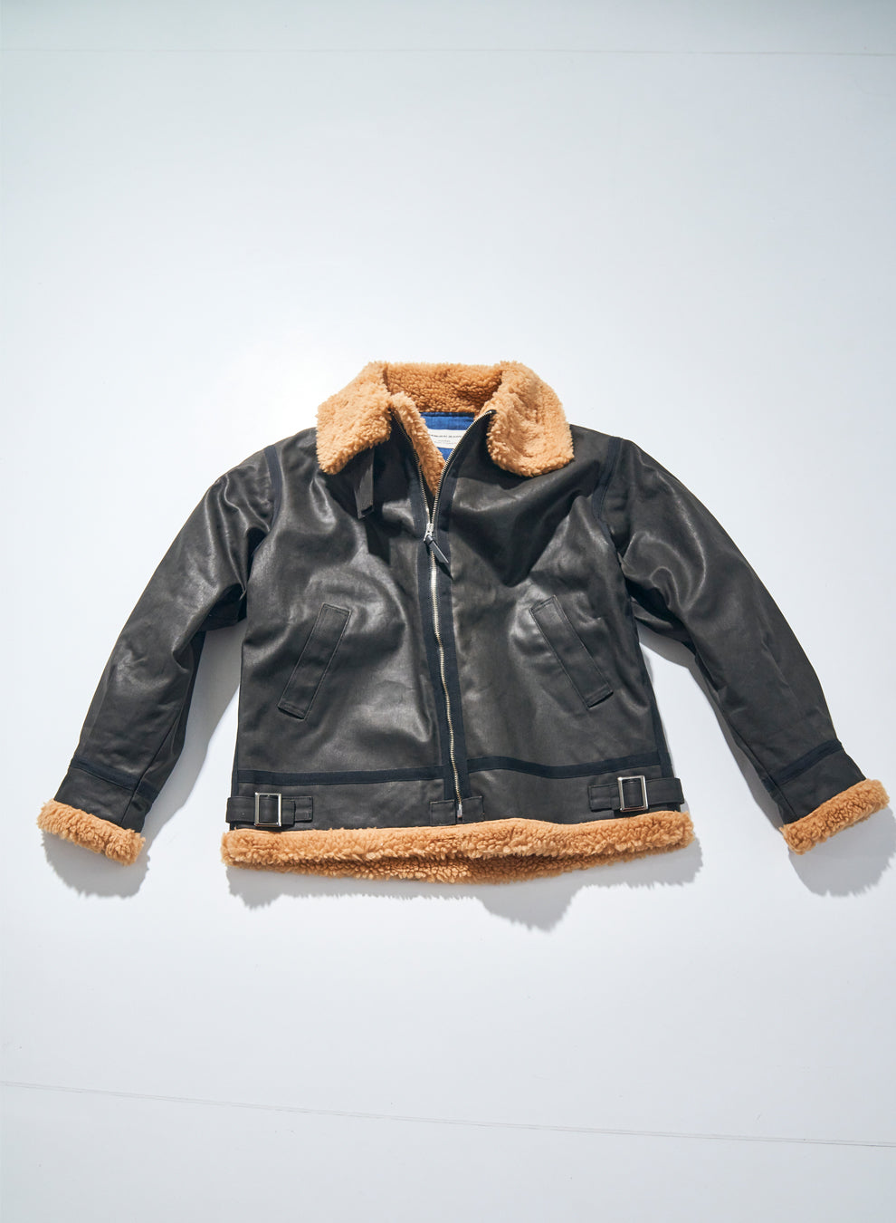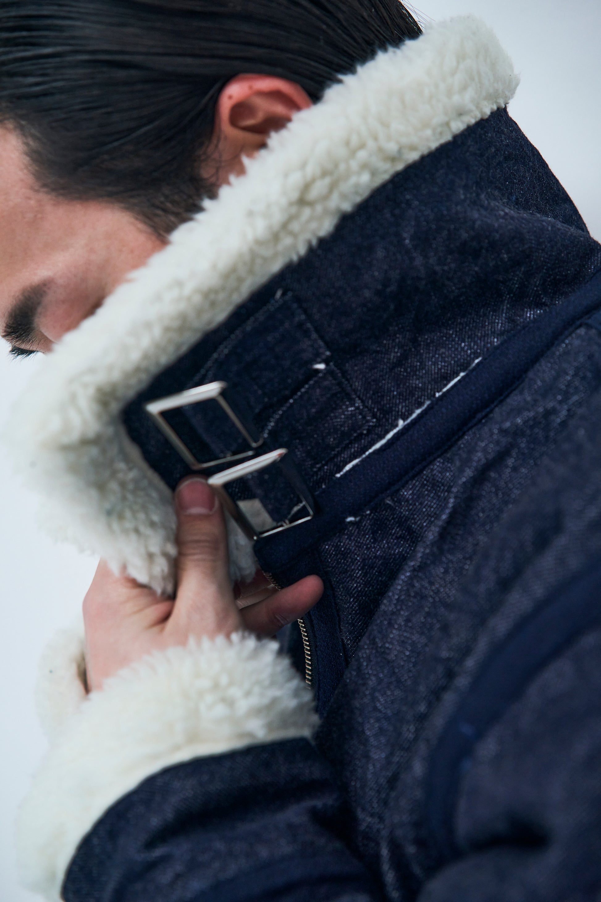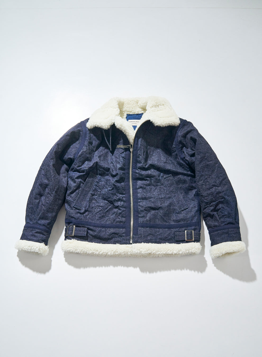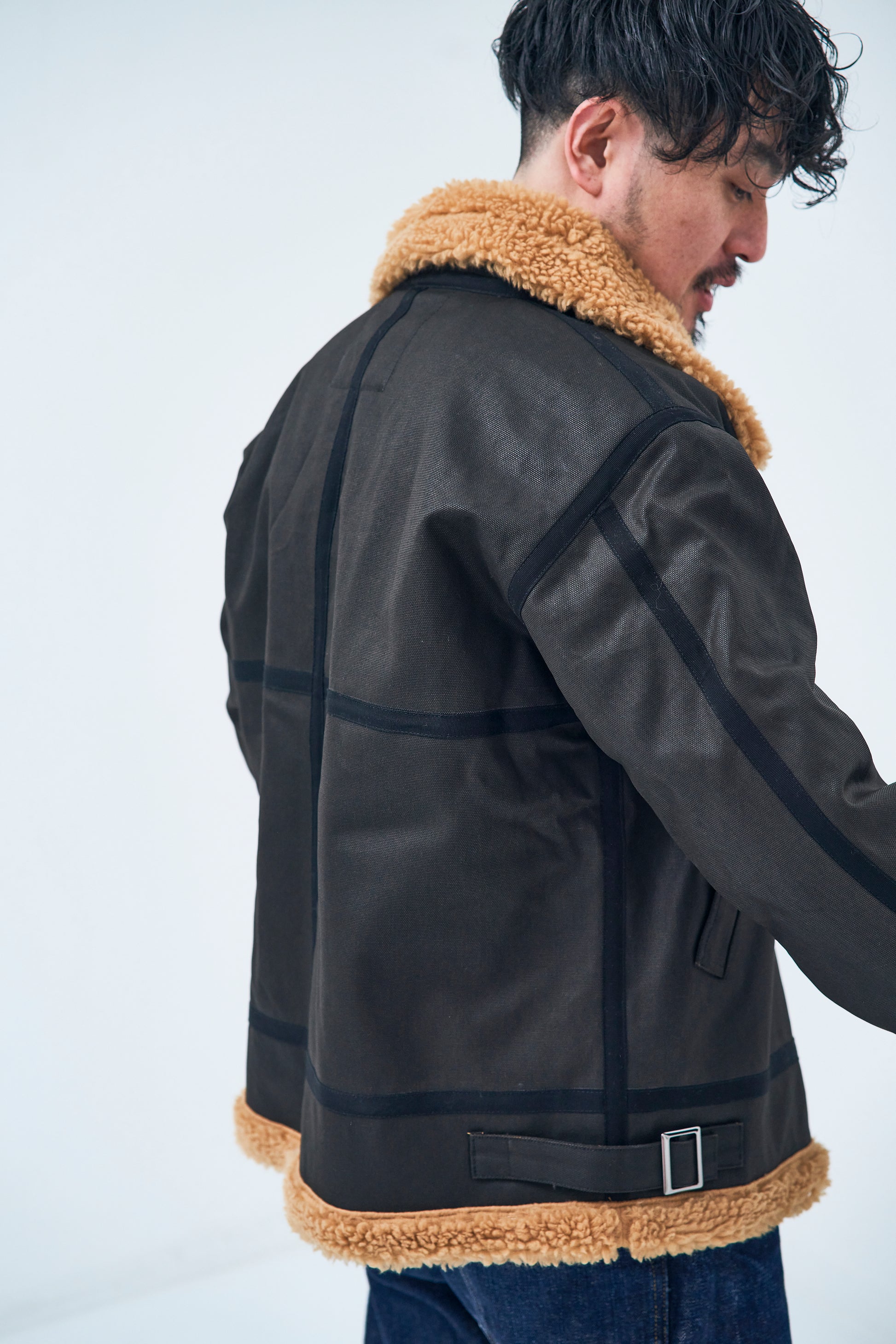 15ozデニム/ブラックカバードヘビーダック生地によるB-3タイプのジャケットです。表地のデニムは、オリジナル15ozデニム、ブラックは、肉厚でザックリとした表面感をもつブラウンダック地に特殊加工を施し、黒をのせたオリジナル生地を、それぞれ使用しています。裏地は丸洗いが可能となるよう軽くて保温性もあるリサイクルポリエステルボアを採用しております。レイヤードやオーバージャケットとしての役割を果たせるよう、通常のサムライのジャケットのサイズ感やシルエットに比べ、やや大きめとしています。また、本来シープスキンによって作られるものですがサムライらしくコットンファブリックを使う事で色落ち・アタリの変化も楽しめるものとなっています。