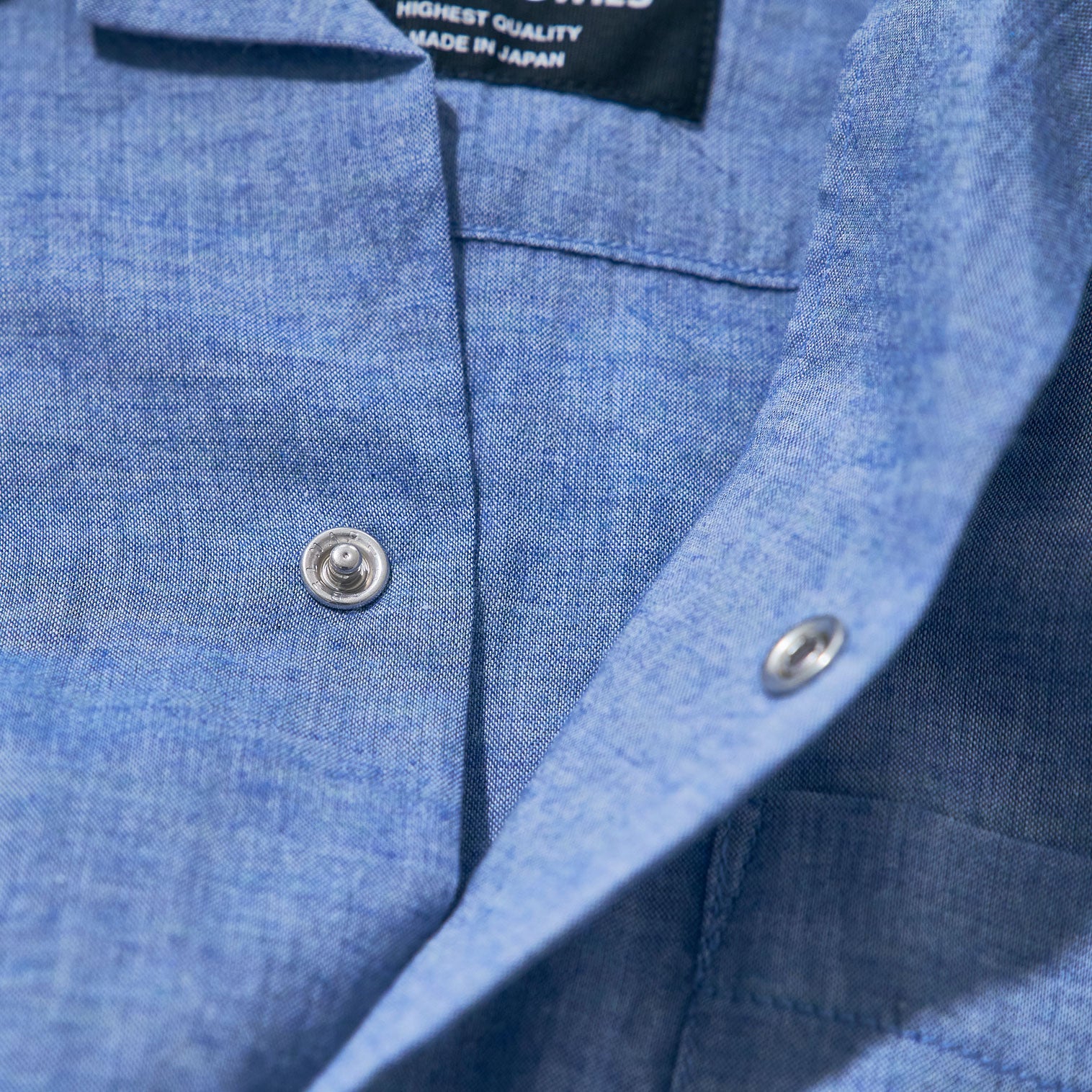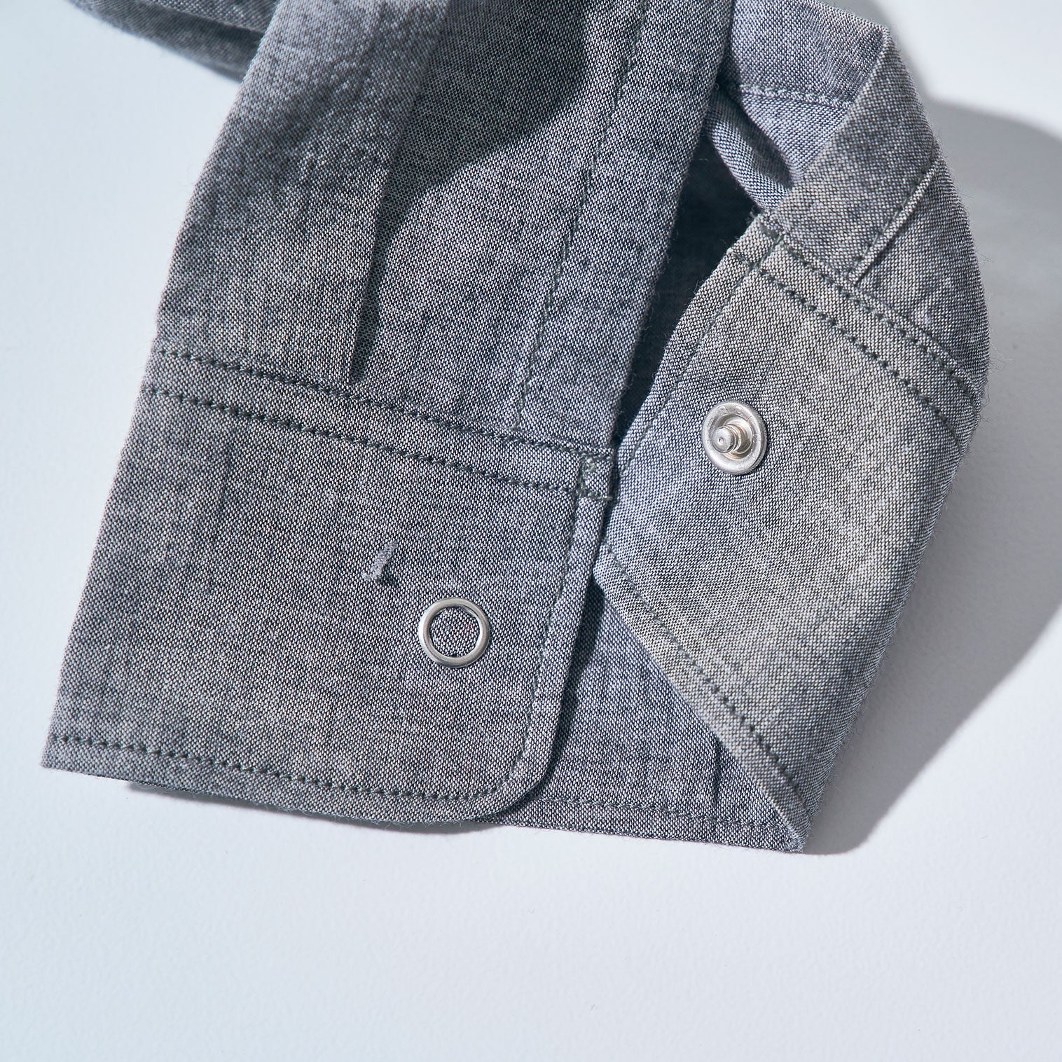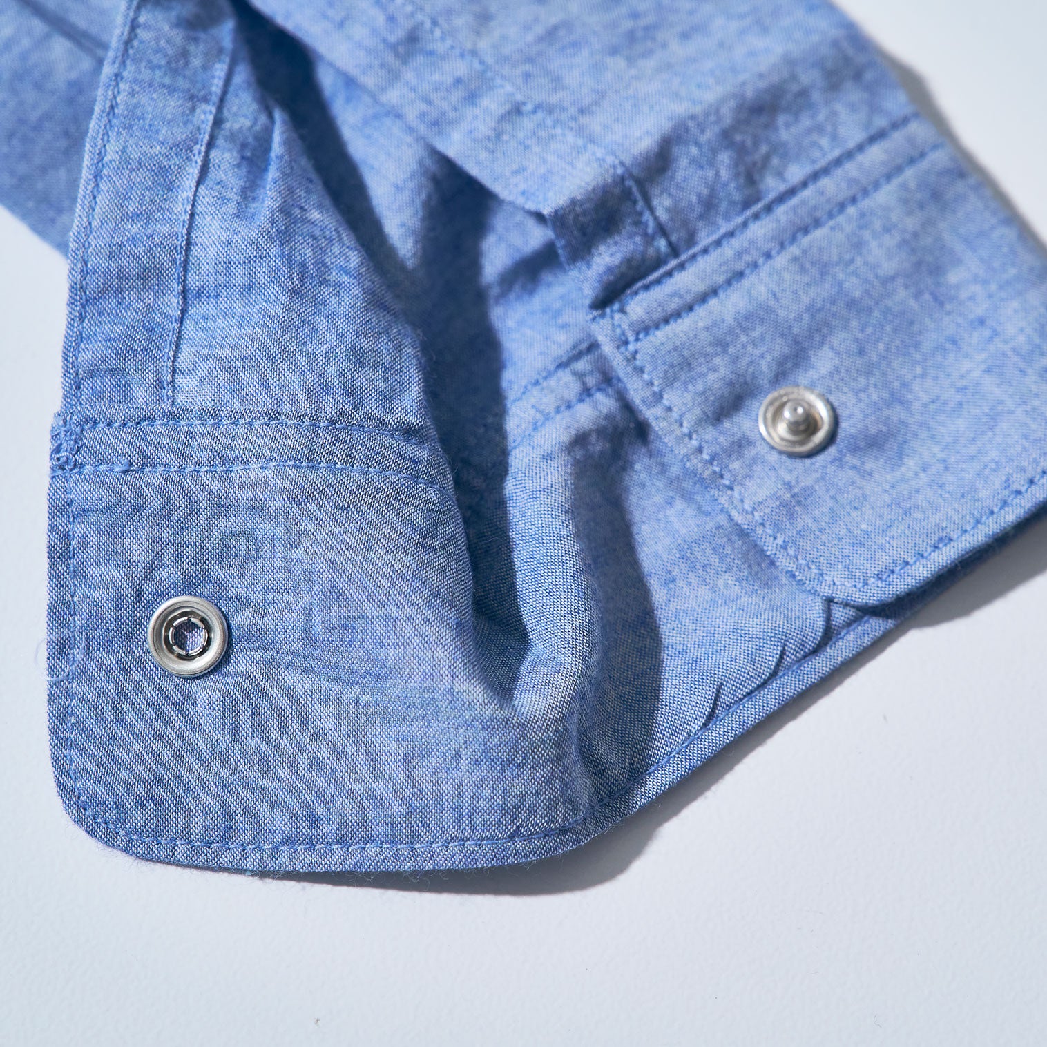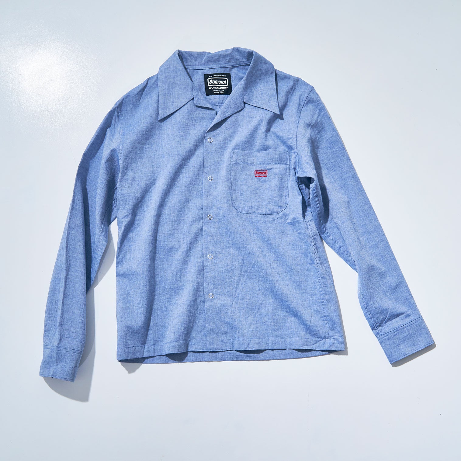 コットンシャンブレー生地を使用した長袖オープンカラーシャツです。