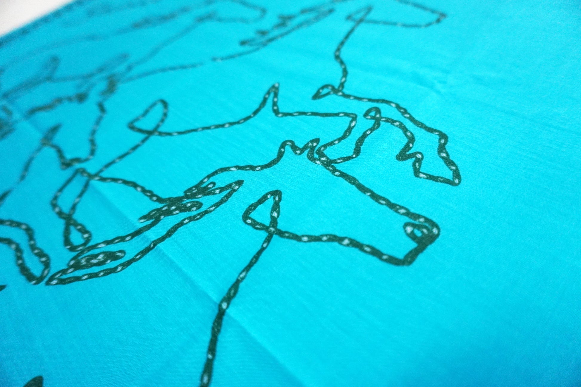 「物事が”うま”くいく」「幸運が駆け込んでくる」などと言われ、縁起の良い動物とされる午(馬)をあしらったバンダナです。馬の輪郭をチェーンステッチ風で表現し、それに併せ全ての端にチェーンステッチを施したユニークなデザインに仕上がっています。バンダナ使いはじめ、スカーフ、風呂敷と汎用性が高いアイテムになります。
