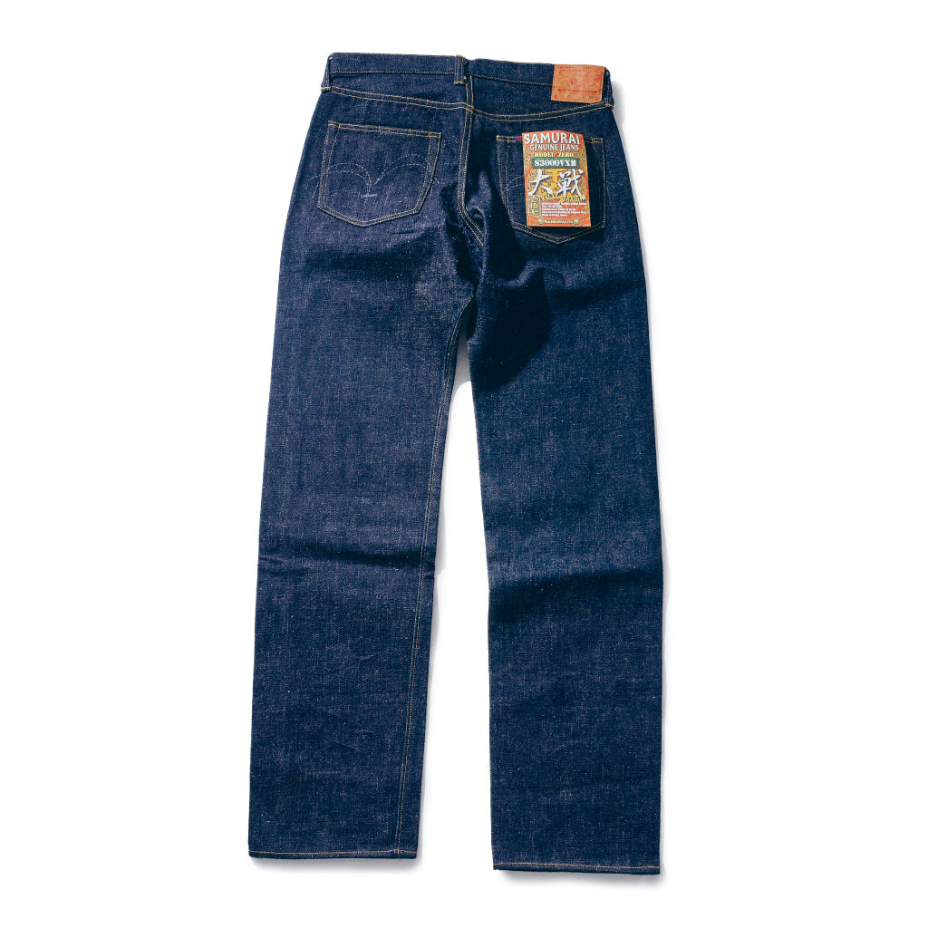 Spec:17oz武士道セルビッチデニム/赤へリンボンスレーキ/鉄製松ノ木ボタン/銅製銭型リベット/専用革パッチ・フラッシャー/やや太めのストレート/ワンウォッシュ済/日本製