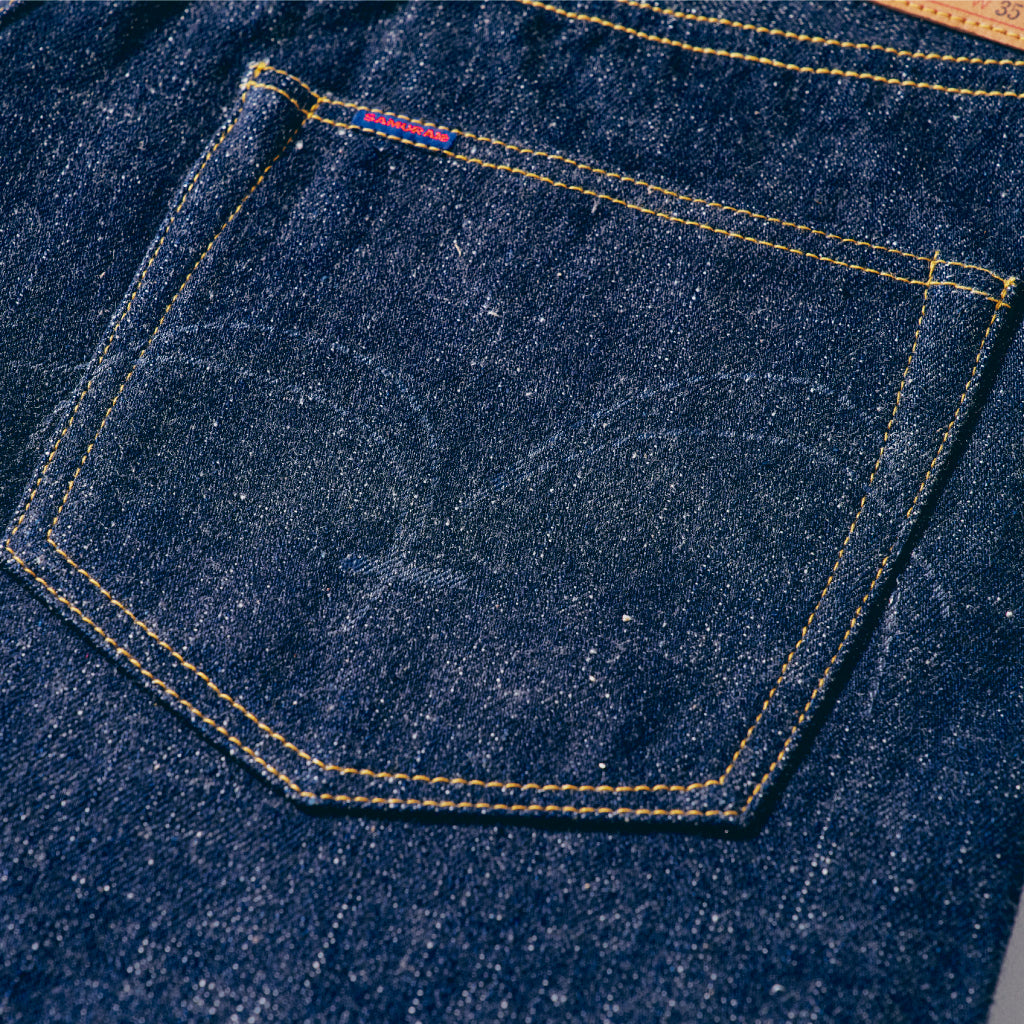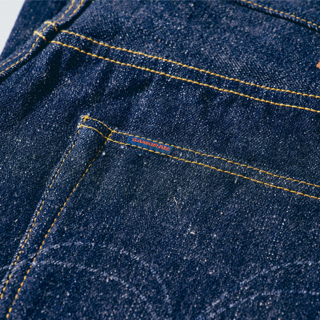 デニム生地は「17oz武士道セルビッチ」を採用。硬い質感の5番ムラ糸を使い、旧式力織機により弱テンションで織り上げ、ヘビーオンスでありながらザラ感が強く、濃淡のある点落ちとアタリ感を楽しめます。