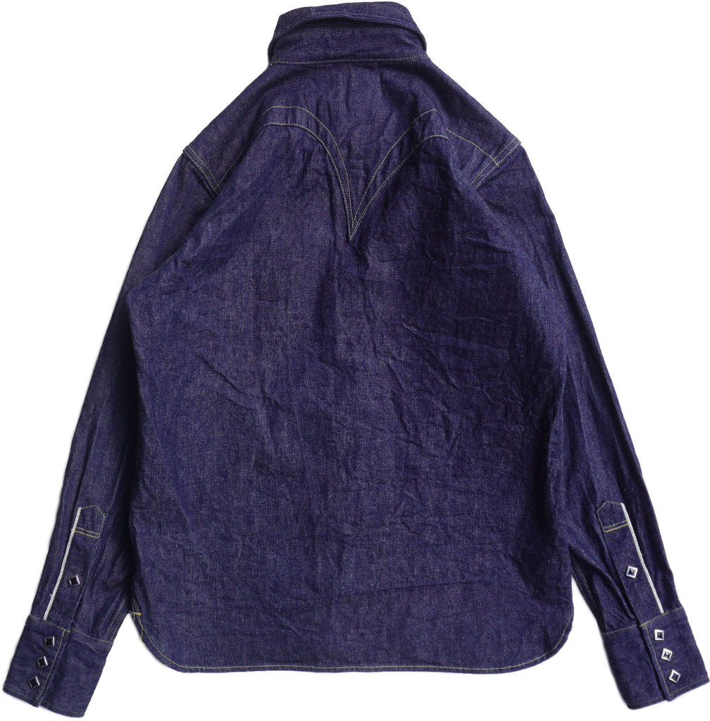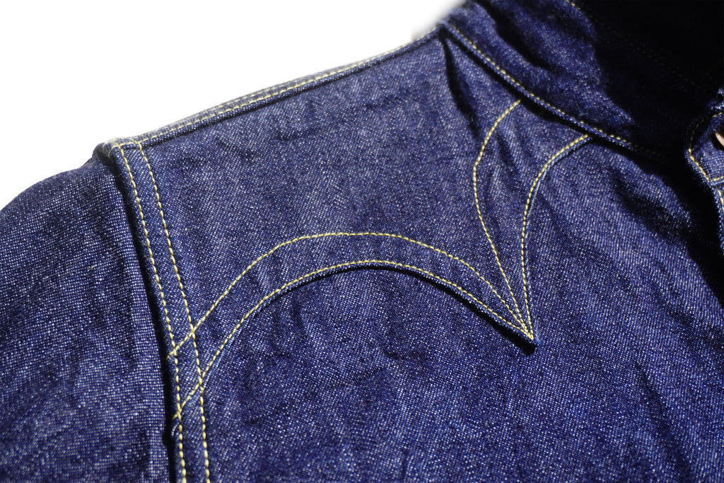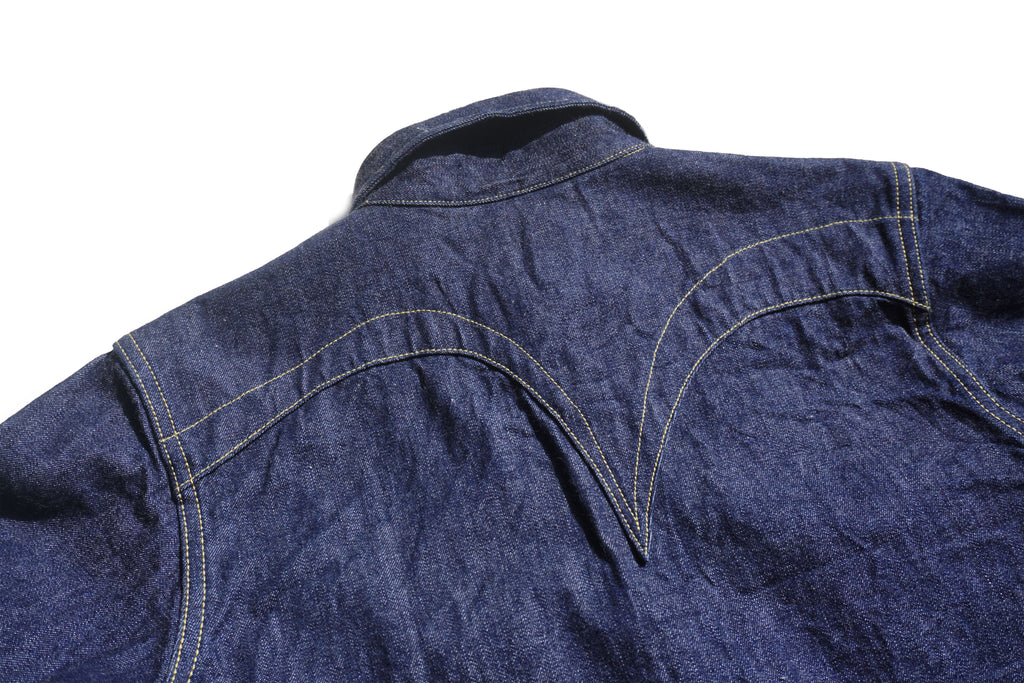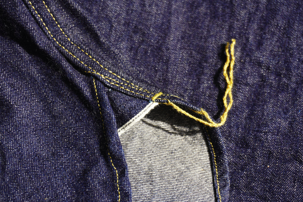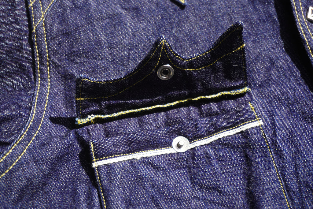 生地は10番のムラ糸によるオリジナルのセルビッチデニムです。シルエットはタイト目でバランスの良い着こなしを考えました。風合いを考えて縫製には主に綿糸を用い巻縫い等の力強いステッチワークも魅力です。ドットボタンはスクエアー型、トップは猫目のナットボタンを採用しています。ヨークやポケットはジーンズのサムライカモメステッチを意識したデザインです。